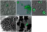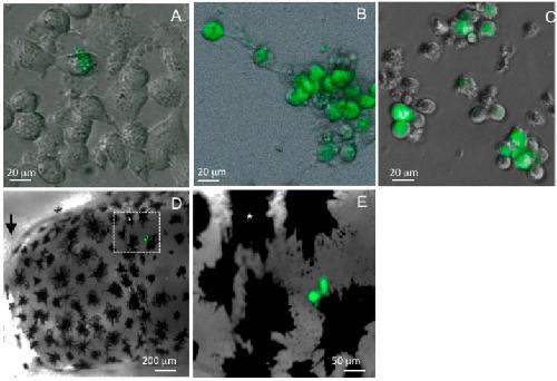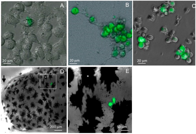 Figure 2. Detection of FV3-GFP knock-in mutant expressing GFP reporter under the control of the immediate early 18K promoter during infection in vitro in mammalian cell lines and in vivo in X. laevis tadpoles. (A) BHK cells at 2 h post-infection at permissive (30 °C) temperature; (B) mouse BV2 macrophage-like microglial cells at 24 h post-infection at permissive (30 °C) temperature; (C) mouse sertoli macrophage TM4 at 24 h post-infection at non-permissive (37 °C) temperature; and (D,E) midbrain view of pre-metamorphic tadpole brain at 1 day post-infection at low (D) and higher (E) magnification. (*) Indicates the same melanophore in panel D and E. Images are composite of phase contrast and fluorescence for cells (AâC) and of bright field and fluorescence of the whole-mounted tadpole, taken under a Leica DMIRB inverted fluorescence microscope and Infinity 2 digital camera (objectives Ã5/Ã10/Ã20; Zeiss). Digital images were analyzed and processed by ImageJ software. |