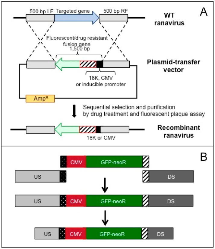 Figure 1. (A) Schematic for generating ranavirus recombinant by site-specific integration of a selection cassette. This cassette consists of a fluorescent reporter gene fused to a drug resistance gene by a short linker that is under the control of a ranaviral or ectopic promoter. This cassette is flanked by a left and right sequence portion (500 bp) of the targeted site and is cloned into a convenient bacterial plasmid. Cells are transfected with the construct using lipofectin and then infected with wt ranavirus to generate homologous recombination. The selection is performed sequentially by virus replication in the presence the drug and then by isolation of fluorescent plaques. (B) Schematic representation of the standardized process to generate a recombination cassette for Ambystoma tigrinum virus (ATV). Primers are designed to amplify the neomycin resistance (GNR) cassette as well as approximately 1000 nt of the upstream (US) and downstream (DS) flanking sequences for each target open reading frame (ORF). Adapter sequence added to the 3′ end of the US sequence and the 5′ end of CMV promoter. In addition, a different adapter is added to the 3′ end of the cytomegalovirus promoter (CMV-GNR) cassette and the 5′ end of the DS sequence. A standardized overlapping PCR protocol assembles the recombination cassette that is then agarose gel purified and re-amplified using primers that truncate the US and DS sequences t. This PCR product is then used to generate a recombinant virus. |