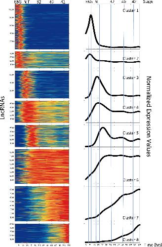 Temporal expression dynamics of lncRNAs. The expression values of individual candidate lncRNAs are normalized by their maxima. These expression profiles are assigned (k-means clustering) to 8 different expression clusters. A) The heatmaps show individual normalized expression patterns for all 5689 lncRNAs. B) The plots demonstrate the average expression of all genes within individual clusters. Each blue bar in panel B corresponds to egg (E), late blastula (B), gastrula (G), neurula (N), tailbud (T).