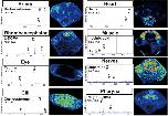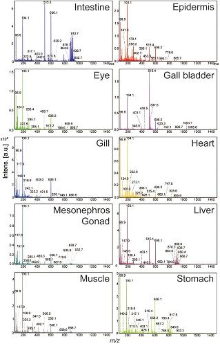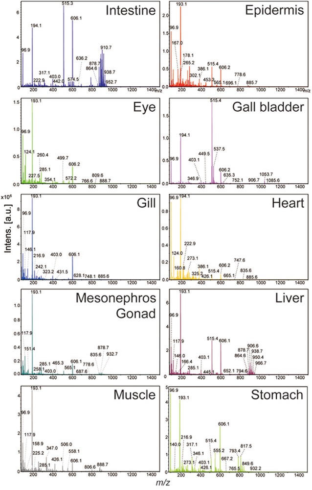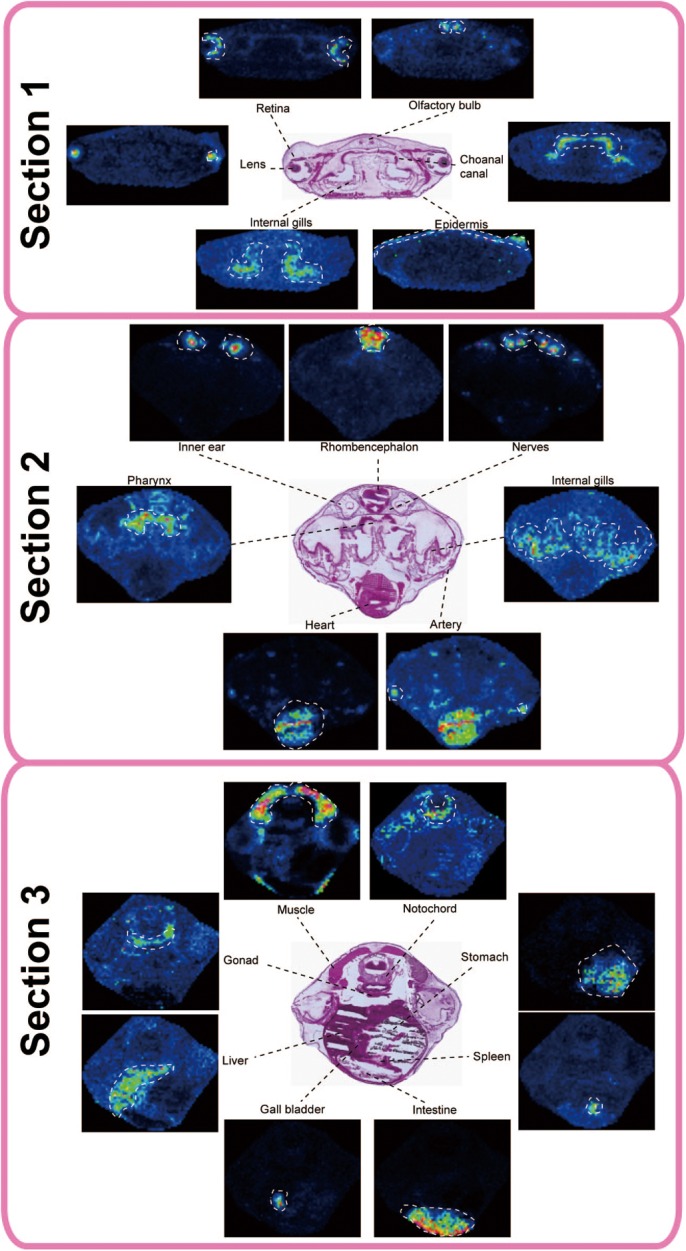 Fig. 4. Mass spectrometry imaging for each tissue-specific peak. In section 1 molecular ions specifically distributed in the retina, olfactory bulb, lens, choanal canal, internal gills, and epidermis. In the same manner, inner ear, rhombencephalon, nerves, internal gills, pharynx, heart, and artery were separated by tissue-specific peaks in section 2, and molecular markers of muscle, notochord, gonad, liver, stomach, spleen, gall bladder, and intestine were imaged in section 3. Table 2 lists the detected peaks. We tested 3 individual animals and confirmed the same localization (N=3).
