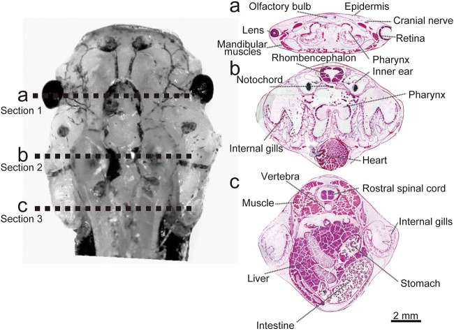 Fig. 1. Characteristics of tadpole samples. Left panel shows an upper view of the head of a tadpole. The dotted lines (a, b and c) show the position of each cross section cut. Hematoxylin and eosinâstained cross sections at positions a, b and c are shown in the right panel. Scale bar: 2â mm.