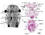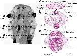 Xenopus tropicalis tadpole NF stage 56, head and pharyngeal region in cross section: Left panel shows an upper view of the head of a NF stage 56 tadpole. The dotted lines (a, b and c) show the position of each cross section cut. Hematoxylin and eosinâ stained cross sections at positions a, b and c are shown in the right panel. Scale bar: 2 mm.