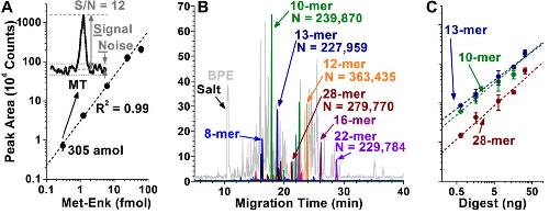 Fig. 2. Trace-level separation and quantification of peptides using CE-μESI-HRMS.A, Quantification was demonstrated across a 3 log-order dynamic range with a ∼75-amol estimated lower limit of detection for Met-Enk. B, The base-peak electropherogram for a 20 ng digest of a 16-cell Xenopus embryo demonstrated complex molecular composition. The extracted-ion currents monitor 9 different peptides (mers) with ± 50-mDa window that were identified from vitellogenin b1 (vtgb1), an abundant, native protein in the embryo (see peptide sequences in supplemental Table S1A. C, Peptide detection was quantitative also in this complex matrix, as exemplified for the vtgb110-mer2+, vtgb113-mer2+, and vtgb128-mer4+ signals. Error bars show S.E.M. in all panels. Parameters of linear regression (intercept/slope/R2): 4.52/1.07/0.99 for Met-Enk; 4.94/0.815/0.98 for vtgb110-mer2+; 5.07/0.730/0.99 for vtgb113-mer2+; and 4.33/0.861/0.96 for vtgb128-mer4+. |