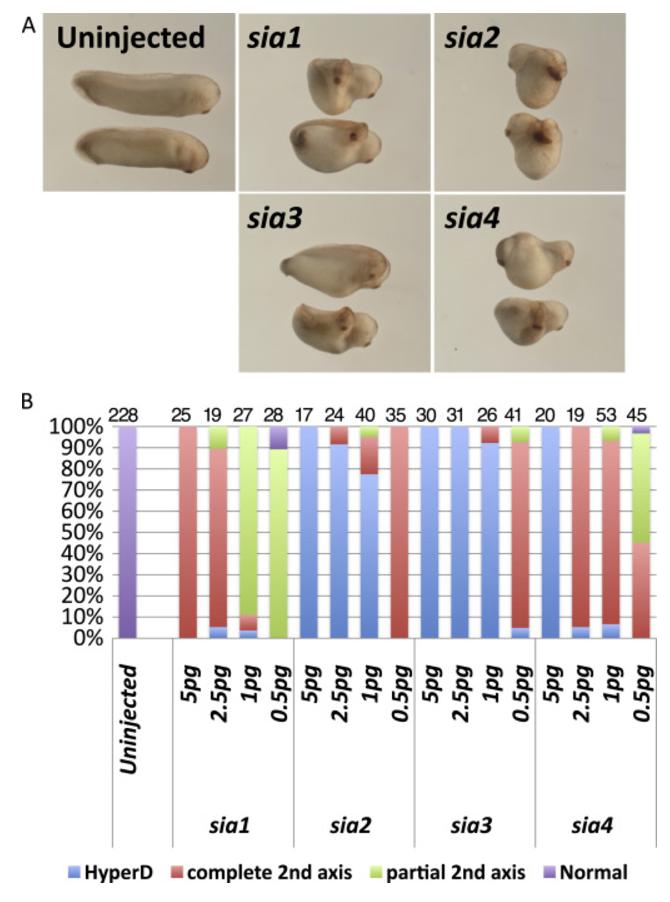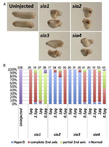 Activity of X. tropicalis siamois-related genes. X. tropicalis siamois-related genes (sia1, sia2, sia3, and sia4) were over-expressed with total amounts of 0.5, 1, 2.5, 5 pg mRNA into ventral-vegetal cells of X.laevis embryos at 4â8-cell stages. (A) Representative embryos injected with 2.5 or 1 pg mRNA of each siamois-related gene. (B) The percentage of embryos in which the secondary axis was observed after injection of mRNAs of siamois-related genes. The number of embryos analyzed is shown above each bar. All siamois-related genes in X. tropicalis induced complete secondary axis.