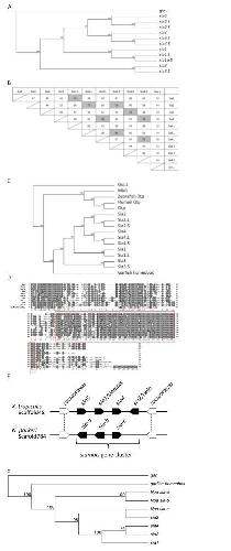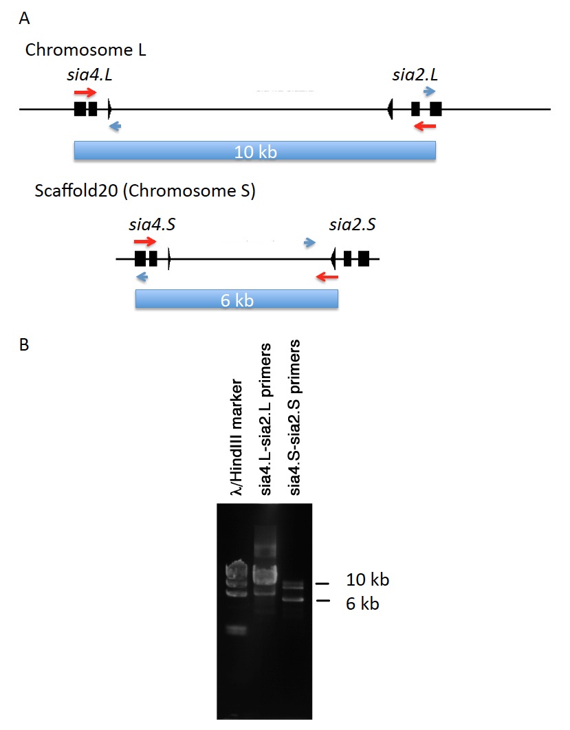 Verifications of genome assembly. (A) Primers to verify gene directions. Genome assembly indicated that sia2. L and sia2. S are located next to sia4. L and sia4. S respectively with opposite direction. To verify this, the light blue regions were amplified with primers indicated with red arrows. The ends of amplified products were sequenced with primers indicated with light blue arrows. The sequences of these primers were shown in Table 1. (B) The amplified products. The lengths of products estimated from assembly were 10 kb for âLâ and 6 kb for âSâ. The estimated bands were gel-extracted and sequenced. Sequencing showed that the amplified regions and directions are correct. Genomic DNA was obtained from red blood cell of J-strain using standard methods, previously described (Sive et al., 2000).