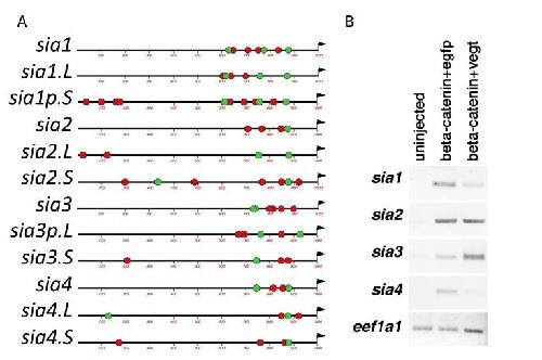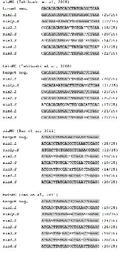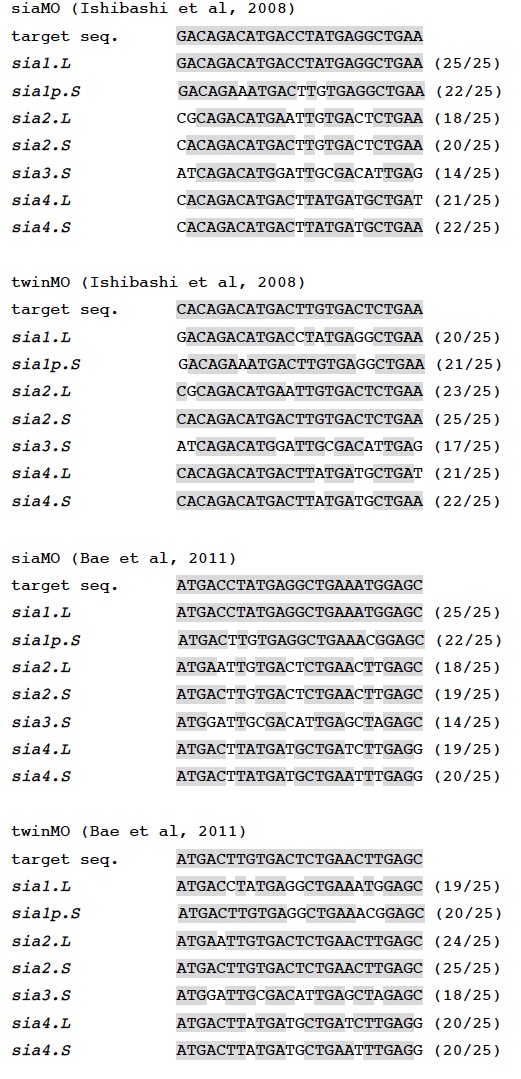 Suppl. Fig. S3. Supplementary Fig S3 Previously published MO target sequences of siamois (sia1. L) and twin (sia2. S) and the equivalent region of siamois-related genes in X. laevis (J-strain). Target sequence of each MO is indicated on the top ( Ishibashi et al., 2008 ; Bae et al., 2011). Gray shaded bases are identical to target sequence. The ratio (identical bases / target bases) is shown on the right of sequences.