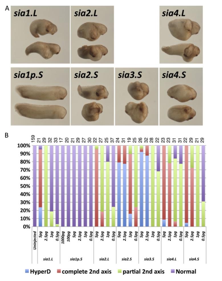 Activity of X. laevis siamois-related genes. Seven X. laevis siamois-related genes (sia1. L, sia2. L, sia4. L, sia1p. S, sia2. S, sia3. S, and sia4. S) were over-expressed with total amounts of 0.5, 1, 2.5 and 5 pg mRNA, (100 and 1000 pg for sia1p. S) into ventral-vegetal cells of X. laevis embryos at 4â8-cell stages. (A) Representative embryos injected with 5 pg mRNA of each siamois-related gene. (B) The percentage of embryos in which a secondary axis was observed after injection of mRNAs of siamois-related genes. The number of embryos analyzed is shown above each bar. sia1p. S has no activity. All siamois-related genes in X. laevis except for sia1p. S induced a complete secondary axis.