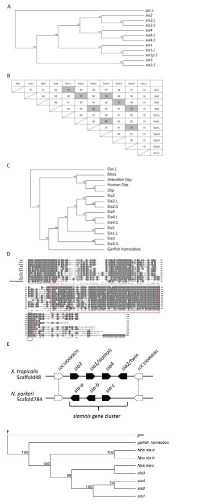 Conservation of siamois-related genes. (A) Phylogenetic tree of nucleotide sequences of siamois-related genes in X. tropicalis and X. laevis. cDNA sequences were obtained by cloning from X. tropicalis Nigerian strain or X. laevis J-strain. Accession numbers are described below [X. tropicalis (sia1: LC167289, sia2: LC167290, sia3: LC167291, sia4: LC167292), X. laevis (sia1. L: LC167293, sia2. L: LC167295, sia4. L: LC167298, sia1p. S: LC167294, sia2. S: LC167296, sia3. S: LC167297, sia4. S: LC167299)]. The gsc. L (Xenbase Gene ID: XB-GENE-6252605) was used as an outgroup. (B) Orthologous and homeologous comparisons of Siamois-related proteins as percent identity using ClustalW alignment. Gray colors indicate high similarity over 65%. (C) Phylogenetic tree of amid acid sequences of siamois-related genes and closely related genes. Deduced amino acid sequences were used. Gene accession numbers, Xenbase gene IDs, and protein IDs are described below [X. tropicalis (sia1: LC167289, sia2: LC167290, sia3: LC167291, sia4: LC167292, mix1: XB-GENE-485898, Otp: XP_002940916), X. laevis (sia1. L: LC167293, sia2. L: LC167295, sia4. L: LC167298, sia2. S: LC167296, sia3. S: LC167297, sia4. S: LC167299, gsc. L: XB-GENE-6252605), Human Otp: XP_942665, Zebrafish Otp: NP_001122175]. A homeobox protein of a spotted garfish (Lepisosteus oculatus) is XP_006627557 (1â220aa were used). Gsc. L was used as an outgroup. (D) The amino acid sequence alignments of siamois-related proteins. Homeodomain is boxed in red. (E) A schematic representation of the genome scaffolds containing X. tropicalis and N. parkeri siamois-related genes. Boat-shaped boxes indicate the direction of the coding frame. Siamois-related genes are depicted in black. Orthologous sequences are connected with dashed lines. Predicted coding sequences (CDSs) of N. parkeri sia-aâc are shown in Supplementary Text 1. (F) Phylogenetic tree of nucleotide sequences of siamois-related genes in X. tropicalis and N. parkeri. A homeobox gene of a spotted garfish (LOC102694986: 1â660, 1258â1260 were used) is shown in Supplementary Text 1. The gsc (Xenbase Gene ID: XB-GENE-486771) was used as an outgroup. The phylogenetic trees were calculated by MacVector 12.0.2 software [Method: Neighbor Joining; Bootstrap (1000 reps); tie breaking = Systematic, Distance: Uncorrected (âPâ); Gap distributed proportionally].
