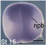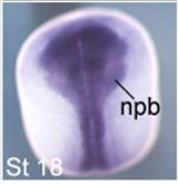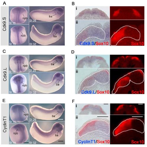 Fig. 1. The expression of the P-TEFb complex components during Xenopus laevis development. Transcripts for the P-TEFb components were detected using NBT/BCIP and expression of CDK9.S, CDK9.L and CyclinT1 appeared blue in the sectioned neurula stage embryo. Sox10 was detected using fast red and fluorescence microscopy. (A) CDK9.S expression at stage 16 and 18 in the neural plate and neural plate border and expression at stages 26 and 32 in the branchial arches. Scale bar=100 µm (Bi) 10à magnification section of a stage 16 embryo showing CDK9.S expression in the neural plate and neural plate border (blue) and Sox10 expression in the neural crest (red). (ii) 20à magnification section shows overlap of the blue CDK9.S expression with the red Sox10 expression. Expression of CDK9.S is outlined with a dashed white line and overlaid onto the Sox10 expression image. Scale bar=100 µm (C) CDK9.L expression at stage 16 and 18 in the neural plate and neural plate border and expression at stages 26 and 32 in the branchial arches. Scale bar=100 µm (Di) 10à magnification section of a stage 16 embryo showing CDK9.L expression in the neural plate and neural plate border (ii) 20à magnification section shows overlap of the blue CDK9.L expression with the red Sox10 expression. Expression of CDK9.L is outlined with a dashed white line and overlaid onto the Sox10 expression image. Scale bar=100 µm (E) CyclinT1 expression at stage 15 and 18 in the neural plate and neural plate border and expression at stages 26 and 32 in the branchial arches. Scale bar=100 µm (Fi) 10à magnification section of a stage 15 embryo showing CDK9.S expression in the neural plate and neural plate border (blue) and Sox10 expression in the neural crest (red). (ii) 20à magnification section shows overlap of the blue CDK9.S expression with the red Sox10 expression. Expression of CDK9.S is outlined with a dashed white line and overlaid onto the Sox10 expression image. Scale bar=100 µm. Npb=Neural plate border, ba=branchial arches. |