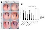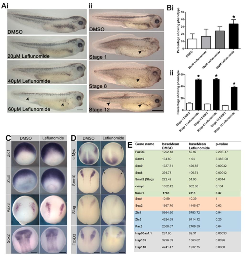 Fig. 2. Leflunomide treatment affects the development of neural crest derivatives expression of neural crest genes. (Ai) Top to bottom shows DMSO treated control embryo, 20 μM, 40 μM and 60 μM leflunomide treated Xenopus laevis embryos. Leflunomide is applied at stage 15. Scale bar=500 µm (ii) Top to bottom shows DMSO treated control embryo, 60 μM leflunomide applied at stage 1, 8 and 12. Phenotype is observed at stage 38. Black arrow heads indicate pigment cell loss. Scale bar=300 µm (Bi) Graph showing the percentage of embryos displaying a pigment loss phenotype after treatment of DMSO n=155, 20 μM n=158, 40 μM n=164 and 60 μM leflunomide n=141. *P<0.05 by Kruskall Wallis statistical test. (ii) Graph showing the percentage of embryos displaying a pigment loss phenotype after treatment of DMSO and 60 μM leflunomide applied at stage 1 (DMSO n=60 leflunomide n=72), 8 (DMSO n=67 leflunomide n=73) and 12 (DMSO n=63 leflunomide n=67). *P<0.05 by Kruskall Wallis statistical test. (C) Whole mount in situ hybridisation carried out on embryos treated with either DMSO or 60 μM leflunomide from stage 4 until stage 13 (Zic1, Zic3 and Pax3) or stage 15 (Sox2). The neural plate border markers Zic1, Zic3 and Pax3 show no change in expression. Similarly, no change is seen for neural plate marker Sox2. Scale bar =200 µm (D) Whole mount in situ hybridisation carried out on embryos treated with either DMSO or 60 μM leflunomide from stage 4 until stage 13 (c-Myc) or stage 15 (Sox10, Slug/Snail2 and FoxD3). Specific loss of c-Myc expression is seen in the anterior region of the embryo (black arrows) and no loss of expression is seen in the posterior neural tissue. Loss of Sox10 expression can be seen (black arrows) and some loss or alteration of expression on Slug/Snail2 and FoxD3. Scale bar=200 µm (E) RNA sequencing carried out on animal caps injected with Wnt-8 and noggin and treated with DMSO or leflunomide. The change in expression seen in specific genes found in the animal cap sample by RNA sequencing is shown. Green=neural crest specifying genes, Orange=neuroectoderm genes, Blue=neural plate border specifiers, Grey=heat shock protein. The complete list of genes affected can be seen in Supplementary data 1. |