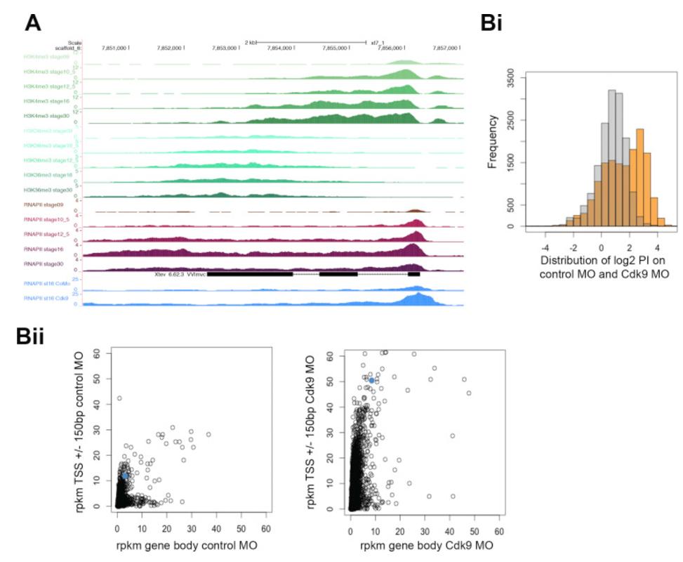 Fig. 4. c-Myc is a paused gene and CDK9 MO causes c-Myc to become more paused during development. (A) Histone methylation and RNA polymerase II (RNAPII) binding at the c-Myc gene. Profiles of H3K4me3 (marking active promoters and 5â² ends of gene bodies, green), H3K36me3 (showing active transcription, light green) and RNA Pol II (RNAPII, purple) (Hontelez et al., 2015) are visualised using the UCSC Genome Browser for the c-Myc gene on scaffold_6:7844903â7863621 (X. tropicalis genome assembly version 7.1). The transcriptional profile shows c-Myc to be a paused gene in Xenopus blastula and gastrula-stage embryos. RNA Pol II profile of the c-Myc gene at stage 16 from embryos injected with control MO or Cdk9s MO (blue). Note that the c-Myc gene is proportionately more paused in the cdk9 MO treated embryos. (B) RNA Pol II ChiP-seq on whole embryos injected with Control MO or Cdk9.S MO. i) Histogram plots showing the distribution of the Pausing Index values (RPKM TSS ±150 bp divided by the RPKM on the gene body) in log2 space for Control MO-injected (grey) and Cdk9.S MO-injected embryos (orange). The populations were shown to be significantly different from each other (Mann-Whitney P-value<2.2Ã10â16), indicative of RNAPII redistribution. ii) c-Myc is more highly paused in Cdk9 MO treated embryos. Scatter plots of RPKM on the gene body versus the transcriptional start site (tss) in Control MO (left panel) and Cdk9.S MO-injected embryos (right panel). The loss of Cdk9 causes an increase in the amount of RNA Pol II bound to the promoter compared to the rest of the gene body. The c-Myc gene is shown by the blue spot. Genes with the strongest increase in gene body RNAPII have the lowest increase in PI, suggesting that RNAPII stalls either at the promoter or in the gene body. The effects of RNAPII inhibition on transcript levels is shown in Fig. 3B. |