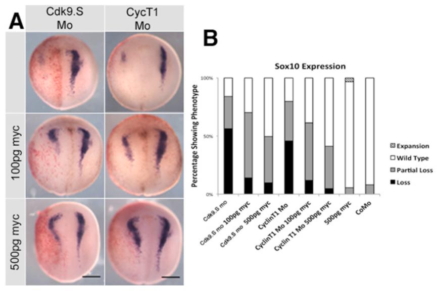 Fig. 5. c-Myc can rescue the effect of Cdk and CyclinT1 morpholino knockdown (A) Embryos were co-injected into one cell of a two cell stage embryo with a morpholino and c-Myc RNA. 300 pg of Lac-Z cRNA was co-injected with morpholinos and RNA. β-gal activity was detected using a red gal stain to monitor lineage tracing. Embryos then underwent Sox10 in situ. Injection of 100 ng Cdk9.S morpholino and 60 ng CyclinT1 morpholino results in a loss of Sox10 expression on the injected side. Co-injection of Cdk9.S and CyclinT1 morpholino with 100 pg c-Myc RNA results in a partial rescue of Sox10 expression. Co-injection of Cdk9.S and CyclinT1 morpholino with 500 pg c-Myc RNA results in a greater rescue of Sox10 expression. Scale bar=200 µm. These results are quantified in Fig. S6D. (B) Graph showing the percentage of embryos displaying an expansion, wild type, partial loss or loss of Sox10 expression pattern by in situ hybridisation after injection of Cdk9.S morpholino alone (n=51) and co-injected with 100 pg (n=114) and 500 pg of c-Myc RNA (n=61). CyclinT1 morpholino alone (n=46) and co-injected with 100 pg (n=61) and 500 pg of c-Myc RNA (n=52). 500 pg of c-Myc RNA alone (n=34) and 100 ng of a standard control morpholino alone (n=33). |