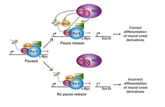 Fig. 6. Model displaying the mechanism by which c-Myc is paused in neural crest cells. On the left c-Myc is shown in a paused state with Pol ll bound to NELF, DSIF and Gdown1. We have shown that a knockdown of the P-TEFb components CDK9 and CYCLINT1 leads to a loss of c-Myc expression and a subsequent loss of Sox10 expression and incorrect development of neural crest derivatives (bottom scenario). This suggests in a wild type neural crest cell, P-TEFb is promoting transcriptional elongation of c-Myc. P-TEFb in its active form bound to the SEC will phosphorylate DSIF, NELF, Gdown1 and serine2 of the C terminal of RNA Pol ll. This promotes pause release on the c-Myc gene and allows the subsequent expression of Sox10 leading to correct synchronous development of neural crest derivatives (top scenario). S2=Serine2, S5=Serine5, P=phosphorylation mark, NELF=Negative elongation factor, DSIF=DRB sensitivity inducing factor, Pol ll=RNA polymerase II, CDK9=Cyclin dependent kinase 9, SEC=Super elongation complex. |