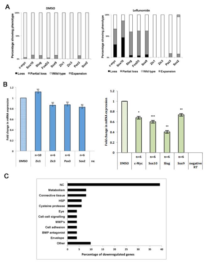Supplementary Figure 1: of Expression patterns of NC genes in embryos affected by leflunomide (A) The in situ hybridisation data was quantified based on whether embryos displayed an expansion, wild type, partial loss or loss of expression phenotype. This is displayed as a percentage of embryos displaying these phenotypes after DMSO treatment (Top panel) for c-Myc (n=106), Sox10 (n=49), Slug (n=54), FoxD3 (n=47), Sox9 (n=39), Zic1 (n=40), Zic3 (n=45), Pax3 (n=43), Sox2 (n=43) and also 60μM leflunomide treatment (bottom panel) for c-Myc (n=108), Sox10 (n=56), Slug (n=62), FoxD3 (n=50),Sox9 (n=47), Zic1 (n=37), Zic3 (n=43), Pax3 (n=34), Sox2 (n=39). (B) qRT- PCR showing level of mRNA expression after 60μM leflunomide treatment compared to DMSO treated whole embryos. Left panel shows the level of expression of Zic1, Zic3, Pax3, Sox2 and a negative reverse transcription (RT) control. No significant change in expression was seen for any of these genes ns = not significant. Right panel shows the level of expression of c-Myc, Sox10, Slug, Sox9 and a negative RT control. All of these show a significant decrease in expression level. *=p<0.05, **=p<0.0000001 and ***=p<0.0000000001. (C) RNA-Seq Graph showing the percentage of genes downregulated in the neural crest animal caps sorted by category. NC = neural crest specific genes, HSP = heat shock proteins, MMPâs = matrix metalloproteinases. |