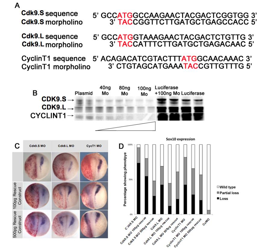 Supplementary figure 2:Morpholino control experiments (A) Morpholino sequences of Cdk9a, Cdk9b and CyclinT1 shown to bind over the start site of their corresponding sequences. ATG start site is shown in red for all three morpholinos and sequences. (B) in vitro translation of Xenopus laevis CDK9.S, CDK9.L and CYCLINT1. Plasmid alone generates protein bands at expected sizes. Increasing amounts of morpholino 40ng, 80ng and 100ng was added to the CDK9.S, CDK9.L and CYCLINT1 in vitro translation showing a dose dependent decrease in the levels of protein detected. A luciferase protein was used as a positive control to ensure the in vitro translation is working. 100ng of each morpholino was added to this positive luciferase control to ensure the morpholinos will not knock down unspecific proteins. (C) To prove thatmorpholinos are specific rescue constructs were generated using site directed mutagenesis to mutate 4 bases around the ATG start site of the Cdk9.S, Cdk9.L and CyclinT1 plasmids. From these plasmids cRNA rescue constructs were generated which would not bind to the morpholinos. CDK9.S, CDK9.L and CYCLINT1 Morpholinos were injected alone or co-injected with 100pg of rescue constructs or 500pg of the rescue constructs. These embryos underwent Sox10 in situ as a read out of the rescue. Embryos were co- injected with 300pg of LacZ cRNA detected using red gal staining as a lineage tracer. All injections were carried out in one cell of a two cell stage embryo and in situ hybridisation was carried out at stage 16. (D) Graph showing the percentage of embryos displaying a wild type, partial loss or loss of Sox10 expression in the injected side after the rescue experiment. Cdk9.S mo n=67, cdk9.S mo 100pg rescue n=35, cdk9.S mo 500pg rescue n=50, cdk9.L mo n=45 cdk9.L mo 100pg rescue n=52, cdk9.L mo 500pg rescue n=23, cyclint1 mo n=59, cyclint1 mo 100pg rescue n=93, cyclint1 mo 500pg rescue n=31, como n=83. |