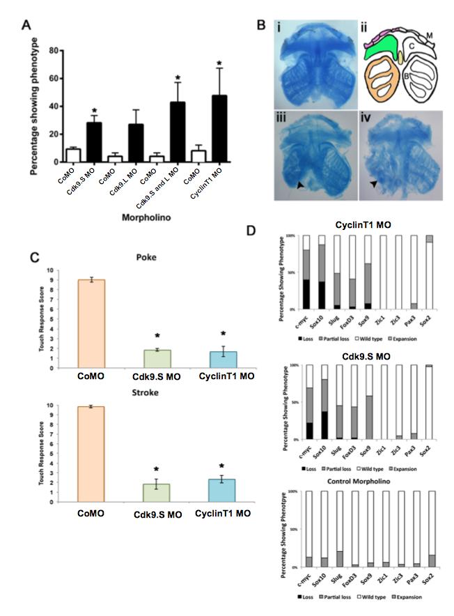 Supplementary figure 3:The phenotype obtained after knock down of P-TEFb components. (A) Graph showing the percentage of embryos displaying a pigment loss phenotype after injection of 100ng standard control morpholino n=119, 60ng CYCLINT1 morpholino n=95, 100ng CDK9.L morpholino n=62 and a combination of both 40ng CDK9.S and 60ng CDK9.L Morpholinos n=73. *=P<0.05 by Kruskall Wallis statistical test. (B) Embryos were morpholino injected in 1 cell of a 2 cell stage embryo left to develop to stage 45 then underwent alcian blue stain to observe craniofacial cartilage. (i) 100ng control morpholino showing wild type craniofacial cartilage. (ii) Schematic of normal wild type craniofacial cartilage M=Meckels cartilage, C=Ceratohyal, B=Branchial cartilage. (iii) Injection of 100ng CDK9.S morpholino shows abnormal development of the branchial cartilage (black arrow head). (iv) Injection of 60ng CYCLINT1 morpholino shows abnormal development of the branchial cartilage (black arrow head). (C) Sensory neuron function was assayed using a poke and stroke assay to assess touch response. This response was scored as follows; swim=1, twitch=0.5, no response=0. Embryos were injected in both cells of a 2 cell stage embryo with either 100ng of a control morpholino, 100ng Cdk9.S morpholino or 60ng CyclinT1 morpholino. Poke: CoMo 9.0 ± 0.25 (n=30), Cdk9.S Mo 1.83 ± 0.14 (n=30), CyclinT1 Mo 1.66 ± 0.52 (n=30). Stroke: CoMo 9.83 ± 0.14 (n=30), Cdk9.S Mo 1.83 ± 0.52 (n=30), CyclinT1 Mo 2.33 ± 0.38 (n=30) *=p<0.05 by one-way ANOVA versus standard control morpholino. CoMo = control morpholino. (D) Graphs showing the percentage of embryos displaying an expansion, wild type, partial loss or loss of expression pattern by in situ hybridisation after injection of 60ng CYCLINT1 morpholino (top panel), 100ng CDK9.S morpholino (middle panel) and a standard control morpholino (bottom panel). Como injected c-myc n=27, sox10 n=29, slug n=38, foxd3 n=35, sox9 n=33, zic1 n=31, zic3 n=55, pax3 n=40, sox2 n=27. Cdk9.S mo injected c-myc n=32, sox10 n=51, slug n=51, foxd3 n=55, sox9 n=31, zic1 n=32, zic3 n=62, pax3 n=38, sox2 n=44. CyclinT1 injected c-myc n=30, sox10 n=46, slug n=37, foxd3 n=32, sox9 n=39, zic1 n=32, zic3 n=70, pax3 n=54, sox2 n=54. |