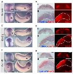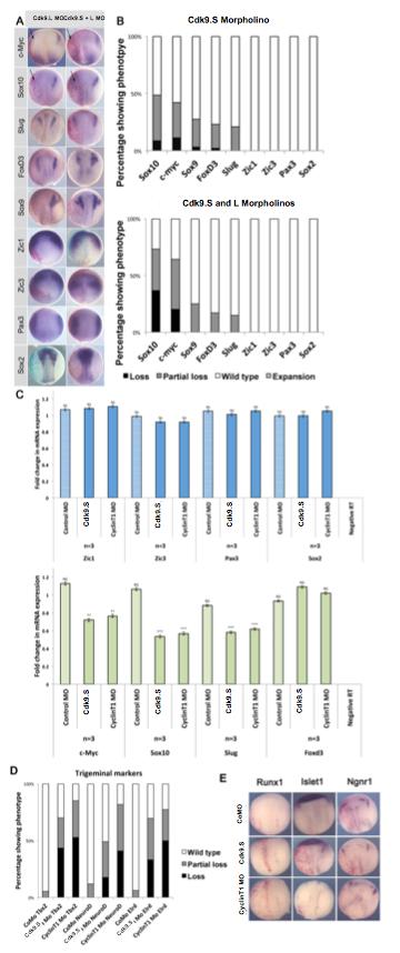 Supplementary figure 4:Knockdown of P-TEFb components CDK9b and a combination of CDK9a and b leads to loss of expression of neural crest genes. All embryos were injected in one cell of a two cell stage embryo with either a control morpholino CoMo, 100ng CDK9b morpholino or 40ng CDK9.S morpholino with 60ng CDK9.L morpholino. 300pg of Lac-Z cRNA was co-injected with morpholinos and β-gal activity was detected using a red gal stain to monitor lineage tracing. in situ hybridisation was then carried out on these embryos for neural crest specifying, neural plate border and neural plate genes. (A) c-Myc expression (stage 13) shows tissue specific loss of expression in the anterior neural crest region (black arrows) after injection of CDK9b morpholino and CDK9.S+L morpholinos. Sox10 (stage 15) shows loss of expression after injection of CDK9.L morpholino and CDK9.S+L morpholinos. Slug expression (stage 15) appears partially lost or altered after injection of CDK9.L morpholino and CDK9.S+L morpholinos. FoxD3 expression (stage 15) appears partially lost or altered after injection of CDK9.L morpholino and CDK9.S+L morpholinos. Sox9 expression (stage 15) appears partially lost or altered after injection of CDK9.L morpholino and CDK9.S+L morpholinos. Zic1 expression (stage 12) appears unchanged after injection of CDK9.L morpholino and CDK9.S+L morpholinos. Zic3 expression (stage 12) appears unchanged after injection of CDK9.L morpholino and CDK9.S+L morpholinos. Pax3 expression (stage 12) appears unchanged after injection of CDK9.L morpholino and CDK9.S+L morpholinos. Sox2 expression (stage 15) appears unchanged after injection of CDK9.L morpholino and CDK9.S+L morpholinos. (B) Graphs showing the percentage of embryos displaying an expansion, wild type, partial loss or loss of expression pattern by in situ hybridisation after 100ng CDK9.L morpholino (top panel) and CDK9.S+L morpholinos (bottom panel) injection. Cdk9.L mo injected c-myc n=45, sox10 n=35, slug n=33, foxd3 n=43, sox9 n=33, zic1 n=27, zic3 n=30, pax3 n=25, sox2 n=34. Cdk9.S and L injected c-myc n=50, sox10 n=30, slug n=53, foxd3 n=58, sox9 n=57, zic1 n=42, zic3 n=63, pax3 n=49, sox2 n=43 (C) qRT-PCR showing level of mRNA expression after CDK9.S or CYCLINT1 knockdown compared to standard control morpholino injected whole embryos. Top panel shows the level of expression of Zic1, Zic3, Pax3, Sox2 and a negative reverse transcription (RT) control. No significant change in expression was seen for any of these genes ns = not significant. Right panel shows the level of expression of c-Myc, Sox10, Slug, FoxD3 and a negative RT control. Some of these show a significant decrease in expression level. *=p<0.05, **=p<0.0000001 and ***=p<0.0000000001. (D) The effect of CDK9.S and CyclinT1 morpholino knockdown on trigeminal placode markers. Graph showing the percentage of embryos displaying a wild type, partial loss or loss of expression pattern by in situ hybridisation after 100ng control morpholino, 100ng CDK9.S morpholino and 60ng CYCLINT1 morpholino injection. Wholemount in situ hybridisation was carried out for Tbx2, NeuroD and ElrD. Como injected Tbx2 n=36, NeuroD n=33, Elrd n=33. Cdk9a mo injected Tbx2 n=53, NeuroD n=51, Elrd n=33. CyclinT1 mo injected Tbx2 n=34, NeuroD n=44, Elrd n=40 (E) The effect of CDK9 and CyclinT1 morpholino knockdown on trigeminal placode markers. Como injected Runx1 n=37, Islet1 n=31, Ngnr1 n=38. Cdk9.S mo injected Runx1 n=46, Islet1 n=32, Ngnr1 n=39. CyclinT1 mo injected Runx1 n=36, Islet1 n=35, Ngnr1 n=33. |