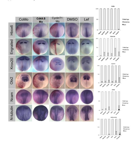 Supplemental Figure 5: Knockdown of pTEFb components CDK9a or CyclinT1 does not affect expression of neural markers. All embryos were injected in one cell of a two cell stage embryo with either a control morpholino CoMo, 100ng CDK9b morpholino or 60ng CyclinT1 morpholino. 300pg of Lac-Z cRNA was co-injected with morpholinos and β-gal activity was detected using a red gal stain to monitor lineage tracing. in situ hybridisation was then carried out on these embryos for neural markers. Como injected Hbox6 n=29, Engrailed n=31, Krox20 n=31, Otx2 n=29, Ncam n=26, N-tubulin n=32. Cdk9a mo injected Hbox6 n=20, Engrailed n=30, Krox20 n=31, Otx2 n=25, Ncam n=26, N-tubulin n=35. CyclinT1 mo injected Hbox6 n=27, Engrailed n=21, Krox20 n=33, Otx2 n=28, Ncam n=26, N-tubulin n=27. DMSO treated Hbox6 n=18, Engrailed n=22, Krox20 n=34, Otx2 n=31, Ncam n=19, N-tubulin n=20. Leflunomide treated Hbox6 n=30, Engrailed n=28, Krox20 n=34, Otx2 n=31, Ncam n=31, N-tubulin n=32. |