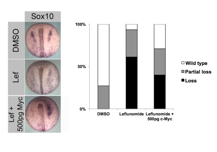 Supplemental Figure 6: c-Myc can rescue the effect of Leflunomide (A) Embryos were injected in one blastomere of a two cell stage embryo with c-Myc RNA. Embryos were then treated from stage 8 with 60uM Leflunomide. Embryos then underwent Sox10 in situ. Treating with leflunomide on its own leads to a loss of Sox10 expression. Injection of c-Myc into one blastomere leads to a partial rescue of Sox10 expression. (B) Graph showing the percentage of embryos displaying the wildtype pattern, partial loss or loss of Sox10 expression. Treatment with DMSO alone (n=30), 60μM leflunomide (n=41) and 60μM Leflunomide plus injection of 500pg of c-Myc RNA into one blastomere (n=35) |