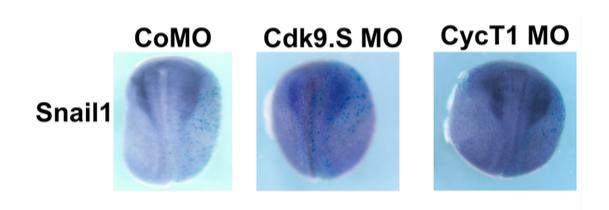 Supplemental Figure 7: Knockdown of P-TEFb components CDK9.S and CYCLINT1 does not affect Snail1 expression. All embryos were injected in one cell of a two cell stage embryo with either a control morpholino CoMo, 40ng CDK9a morpholino or 60ng of CyclinT1 morpholino. 300pg of Lac-Z cRNA was co-injected with morpholinos and β-gal activity was detected using an X-gal stain to monitor lineage tracing. in situ hybridisation was then carried out with a Snail1 probe. Note the Snail 1 expression on the injected side with the Cdk9 and CyclineT1 morpholinos looks unchanged or very slightly increased. Embryos are shown as dorsal views with anterior to the top. |