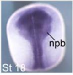 ccnt1 (cyclin T1) gene expression in Xenopus laevis embryo, assayed via in situ hybridization, NF stage 15, dorsal view, anterior up. |