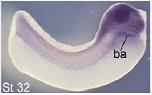 cdk9 (cyclin-dependent kinase 9) gene expression in Xenopus laevis embryo, assayed via in situ hybridization, NF stage 32, lateral view, anterior right. |