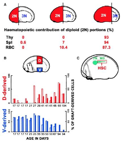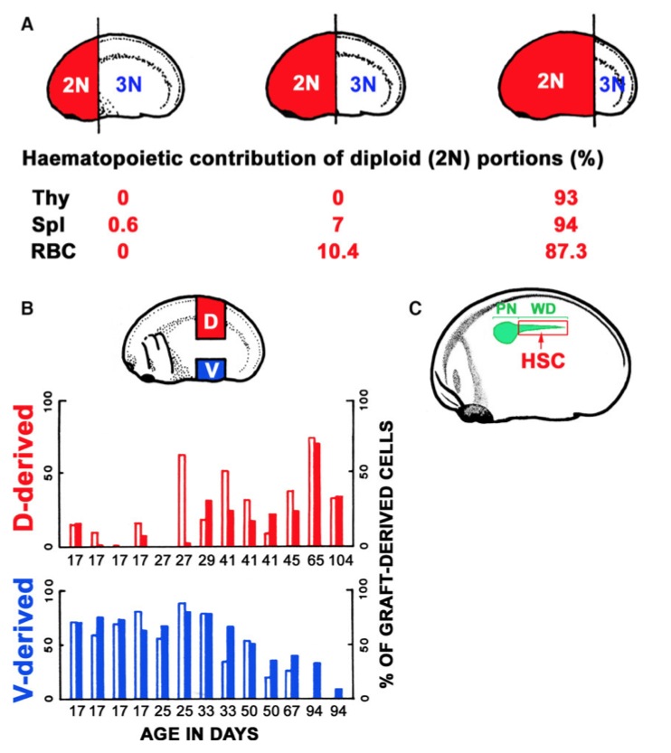 Spl, splenic blood; RBC, red blood cells. Data after Maeno et al. [27]. (B) Dorsal, not ventral, tissues within the trunk give rise to adult blood. Diploid tissues were grafted into triploid recipients and their contribution to thymocytes (open bars) and red blood cells (closed bars) were