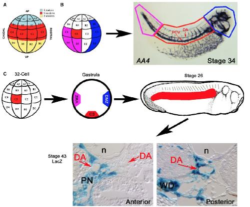 Fig. 3. Fate map in Xenopus embryos indicates AP patterning of the endothelium. (A) Localisation of the germ layers in the 32-cell stage embryo. Haematopoietic and endothelial cells emerge from the mesodermal layer. AP, animal pole; VP, vegetal pole. (B) The 32-cell stage fate map of the dorsal aorta (DA) and other axial vessels shows an AP regionalisation of the vasculature. The contribution of blastomeres of the 32-cell stage embryo to the vasculature are outlined on an embryo stained for expression of the vascular gene, AA4. Anterior to the right and dorsal to the top. PCV, posterior cardinal vein. (C) Time course of blastomere C3 contribution to haematopoietic tissues. Blastomere C3 gives rise to the dorsal LPM at stage 26 and to the DA and HSCs at stage 43 [23]. During gastrulation, C3 derivatives are distinctly localised from the progenitors of embryonic blood in the DMZ and VMZ. Sections show LacZ staining from one of the two C3 blastomeres at two axial levels: at the level of the bifurcated DA (Anterior) and at the level of the medial DA in the trunk (Posterior). C3 contributes to the entire DA of the trunk and, anteriorly, to the bifurcated DA proximal to the trunk. PN, pronephros; n, notochord; WD, Wolffian duct.
