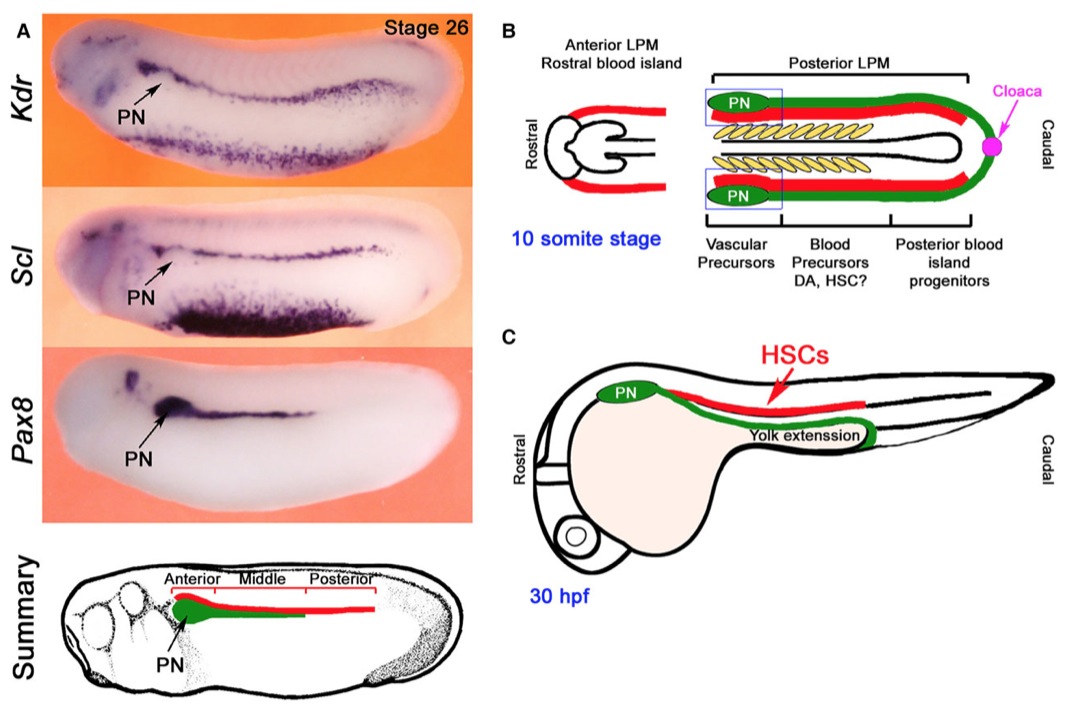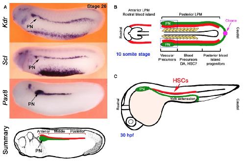 Fig. 4. Haematovascular progenitors within the LPM are regionalised. (A) Comparison of Kdr/Flk1, Tal1/Scl and Pax8 expression in the dorsal LPM of stage 26 Xenopus embryos showing three regions according to their association with the developing pronephric system: an anterior region associated with the pronephros (PN), a middle region associated with the Wolffian duct, and a posterior region without any association with the pronephric system. Transplantation experiments have shown that HSCs derive from the middle region of the LPM. However, further analysis is required to establish whether the anterior and posterior LPM give rise to any HSCs. (B) Regionalisation of the LPM in 10-somite zebrafish embryos. Scl expression, shown in red, subdivides the LPM into anterior and posterior. The posterior LPM localises alongside the Wolffian duct (shown in green) and can be further subdivided into vascular precursors which do not express Gata1, a region proximal to the cloaca which gives rise to the posterior blood island and a middle region which gives rise to embryonic blood. This middle region is also thought to contain HSC precursors. (C) Runx1 expression (red) in the DA of the 30hpf zebrafish embryo localises in the trunk. This region has been shown to undergo EHT to give rise to HSCs. The area expressing Runx1 spans the Wolffian duct (green), is posterior to the pronephros (PN) and does not extend posterior to the yolk extension. Thus, emergence of HSCs appears to be restricted to the trunk.