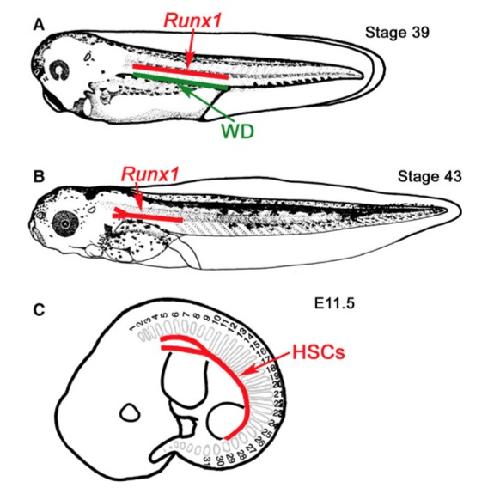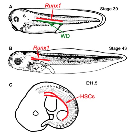 Fig. 5. HSCs emerge in the single medial DA of the trunk and the bifurcated DA proximal to it. (A) Runx1 expression in the Xenopus DA is restricted to the trunk and encompasses the WDs. This suggests that HE only emerges in the trunk. (B) At the time when sprouting of intra-aortic haematopoietic clusters is observed, Runx1 expression is confined to the trunk and also extends anteriorly to the bifurcated DA, suggesting that HSCs may emerge in these vessels too. (C) Functional assays in the mouse have demonstrated that HSCs emerge in the single medial DA of the trunk as well as in the bifurcated DA proximal to it [80].