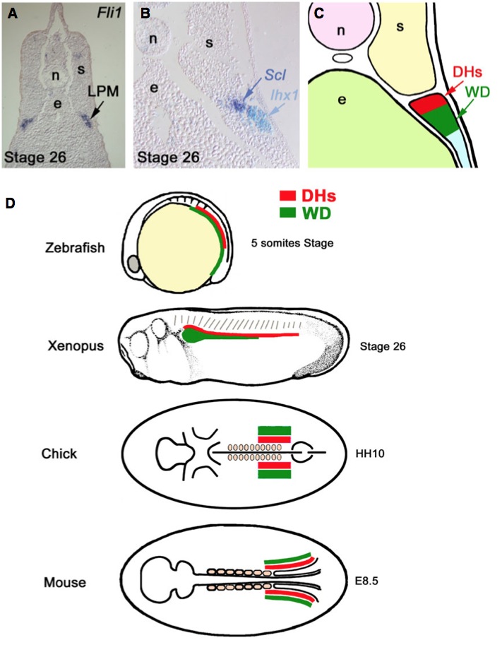 Fig. 2. The lateral plate mesoderm contains definitive haemangioblasts (DHs). (A) Expression of Fli1 in a transverse section of a stage 26 Xenopus embryo, showing the localisation of DHs within the LPM. No morphological differences are noticeable with surrounding cells. Dorsal is to the top. s, somites; n, notochord; e, endoderm. (B) In situ hybridisation showing that Tal1/Scl-expressing DHs localise dorsal to the Wolffian duct anlagen, indicated by Lhx1 expression. Dorsal is to the top. (C) Diagram showing that DHs localise ventral to the somites and dorsal to the Wolffian duct (WD). (D) The emergence of DHs in association with the somites and WD is conserved through evolution. Although the exact location of DHs is only known in Xenopus embryos, Tal1/Scl expression in the LPM (shown in red) of other systems is associated with the somites and WD (shown in green). Red bars in the chick and mouse embryos show the localisation of emerging precursors of the DA, which have been shown to express Tal1/Scl [40,47].