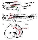 Fig. 1. Haematopoietic stem cells derive from the lateral plate mesoderm. (A) Xenopus diploid–triploid chimeras showing that adult blood derives from the trunk. Very few, if any, cells derive from the head. Chimeras were generated at stage 22 of development. Thy, thymic blood;