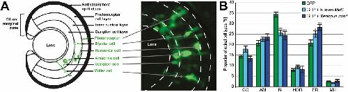 Fig. S4. Human and Xenopus mid1/Mid1 affects fate of retinal precursor cells similarly. (A) Schematic of the retina showing the different cellular layers and retinal cell types. The picture on the right illustrates a clone of GFP-positive cells following lipofection. Cell types are identified according to their position in the layers and their morphology. (B) Human or Xenopus mid1 expression plasmids together with GFP or GFP plasmid alone were lipofected into the area of the eye prospective retinal field at NF stage 17. At NF stage 41, cryosections were done, and the fluorescent cells in the central retina were counted. The different cell types were identified according to their morphology. The diagram shows the percentages of the different cell types for GFP-lipofected embryos (green, n = 40), human Mid1 (light blue, n = 24), and Xenopus mid1 (dark blue, n = 17); error bars represent SEM. AM, amacrine cells; BI, bipolar cells; GC, ganglion cells; HOR, horizontal cells; MU, Müller cells; PR, photoreceptor cells.