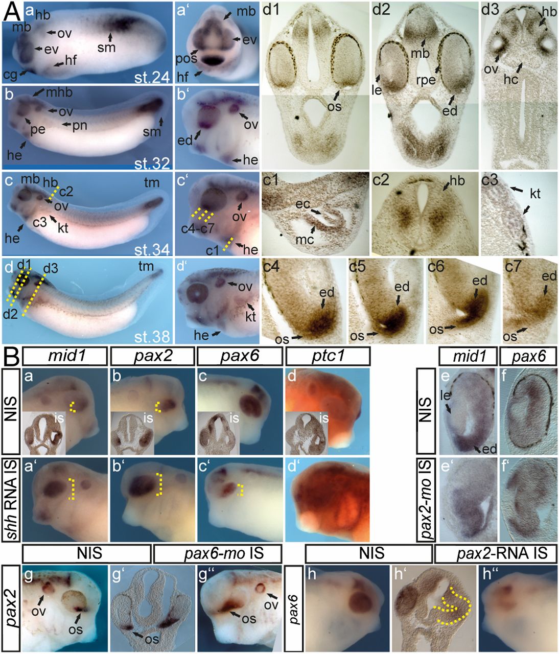 Fig. 1. Mid1 is expressed in cells of the forming optic stalk and induced on shh RNA injection. (A) mid1 mRNA expression was assessed by Wmish on Xenopus laevis embryos at different NF stages. (aâd) Lateral view, (aâ²) cranial view, and (bâ²âdâ²) lateral view. Twenty-micrometer gelatin/albumin sections at the level of the tadpoleâs head (d1âd3), heart (c1), neural tube (c2), and pronephric anlage (c3). cg, cement gland; ec, endocardium; ed, eye disk; ev, eye vesicle; hd, hindbrain; he, heart; hf, heart field; kt, kidney tubules; mb, midbrain; mc, myocardium; op, olfactory placode; os, optic stalk; ov, otic vesicle; pnt, pronephric tubule; pos, presumptive os; sm, somites. (c4âc7) mid1 expression in eye stalk region in serial sections. (B) Injections were done into one cell of two-cell stage embryos. (aâdâ²) Synthetic shh-RNA (500 pg) was injected and Wmish against mid1, pax2, pax6, and ptc1 was performed as indicated. (eâfâ²) pax2-mo (2.5 pmol) was injected, and expression of mid1 and pax6 was monitored. Shown are transversal sections of the eye at the level of the lens. (gâgâ²) pax6-mo (2.5 pmol) was injected, and pax2 was monitored. Shown are lateral views of the head region and a transversal section of the head region at the level of the optic vesicles (gâ²). (hâhâ²) pax2 RNA (100 pg) was injected and expression of pax6 was analyzed.