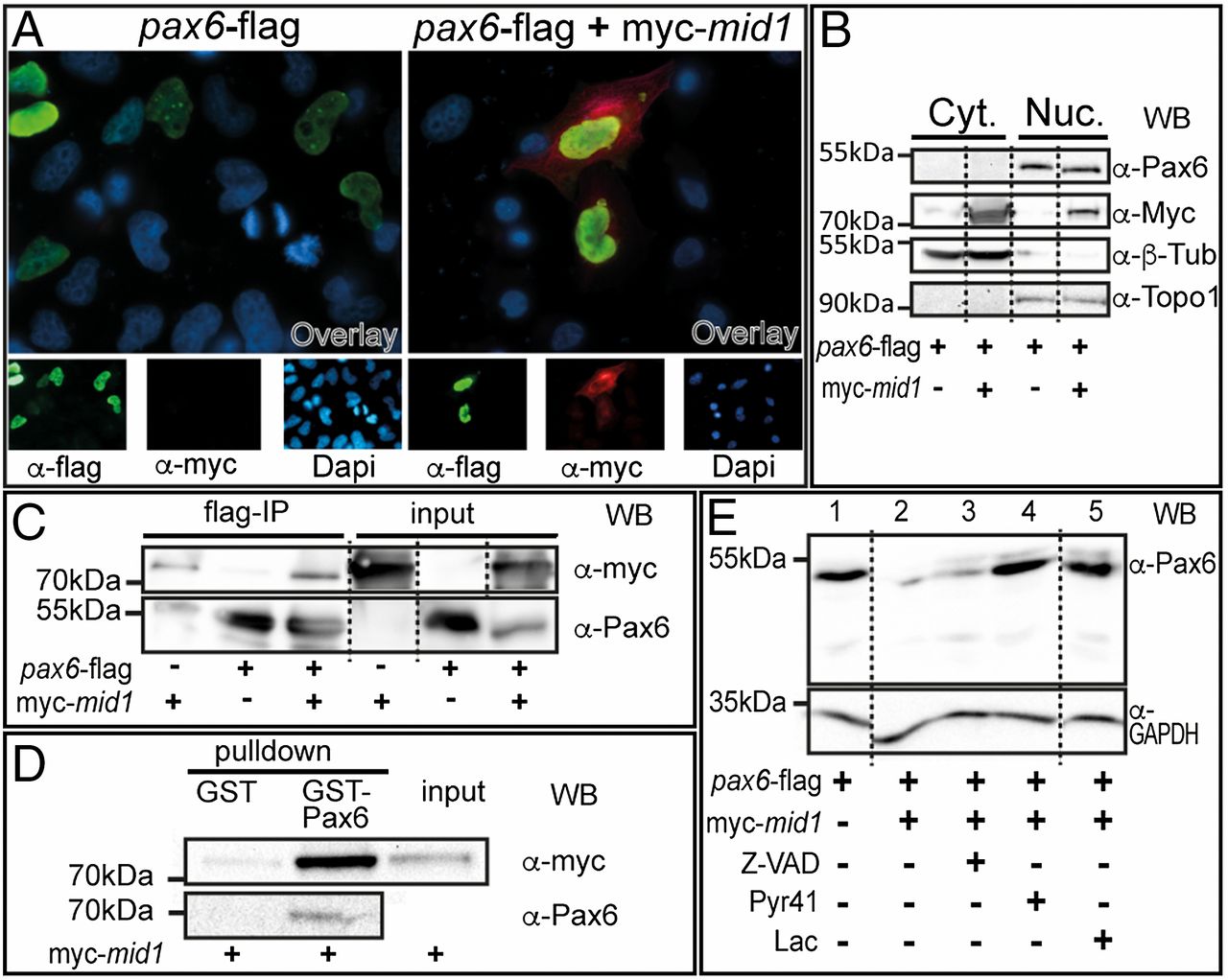 Fig. 2. Mid1 physically interacts with Pax6. (A) HeLa cells were transfected with pax6-flag alone or combined with myc-mid1 and analyzed by immunohistochemistry. Nuclei were stained with DAPI. Pictures are shown in false colors: green for Pax6, red for Mid1, blue for nuclei (Bottom). (B) HEK293 cells were transfected as in A. Cytosolic proteins were extracted with hypotonic buffer. Soluble nuclear proteins were extracted from the remaining fraction with high salt buffer. Blot shows Mid1 and Pax6 in the cytosolic (Cyt.) and nuclear (Nuc.) fractions, as well as the reprobes with antiâβ-tubulin or anti-topoisomerase 1 antibody to control purity. (C) Interaction of Mid1 with Pax6 was assessed by coimmunoprecipitation performed in HEK293. (Left) Eluted myc-tagged proteins after immunoprecipitation (upper blot) and precipitated Pax6 (lower blot, reprobed with anti-Pax6 antibody). (Right) Blots for the input proteins. (D) Interaction of Mid1 and Pax6 was verified by GST using purified GST-Pax6 or purified GST as a control and lysates of HEK293 cells transfected with myc-mid1. (Left) Eluted myc-tagged proteins after GST pull down (upper blot) and precipitated Pax6 (lower blot, reprobed with anti-Pax6 antibody). (Right) Input protein of the lysate. (E) Pax6-flag was expressed alone or together with myc-Mid1 in HEK293 cells in the presence or absence of the proteasome inhibitor lactacystin (Lac), the E1 activating enzyme inhibitor Pyr41, or the caspase inhibitor Z-VAD-FMK (Z-VAD) as indicated. For loading control, blots were reprobed with an anti-GAPDH antibody.