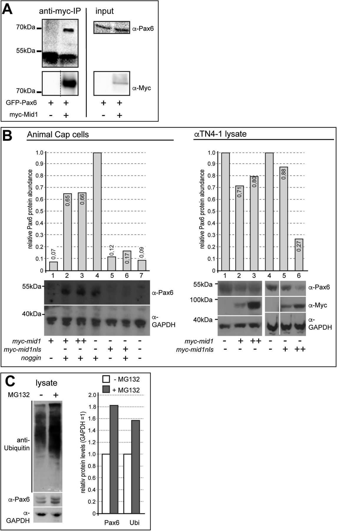 Fig. S2. Mid1 reduces endogenous Pax6 protein. (A) Mid1 physically interacted with Pax6. HEK293 cells were transfected with GFP-pax6 + myc-mid1 or myc-mid1 alone. The left panels show eluted Pax6 protein after immunoprecipitation with an anti-Myc antibody (upper blot) and precipitated myc-Mid1 (lower blot, reprobe with anti-Myc antibody). The right panels show blots with the respective lysates for the input proteins. (B) Xenopus animal cap explants expressed Pax6 upon neuralization by microinjection of 400 μg synthetic RNA of the BMP4 inhibitor noggin. Approximately 30 animal cap explants were separated in each lane. Coinjection of Xenopus mid1 RNA (1 ng) led to a reduction of Pax6 protein abundance. The reduction of Pax6 protein levels was considerably stronger, when Mid1 protein was forced to enter the nucleus by the fusion of a nuclear localization signal (mid1nls). The mouse lens epithelial cell line αTN4-1 expresses pax6 endogenously. Transfection of mid1 and of mid1nls led to a reduction of endogenous Pax6 protein. Corresponding Western blots were quantified with the help of ImageJ and normalized against GAPDH. (C) Pax6 levels increased upon proteasome inhibition. αTN4-1 cells were grown in DMEM medium (10% FCS) and were treated with DMSO (â) or with MG132 (5 μM) (+). Pax6 levels increased upon MG132 treatment (+), as well as polyubiquitinated proteins. Anti-GAPDH was used as a loading control. Densitometry was performed using ImageJ (right graph).