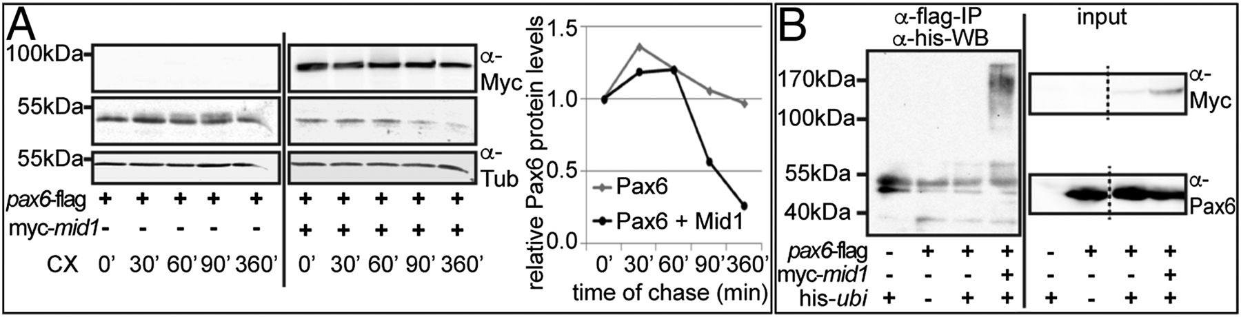 Fig. 3. Mid1 induces ubiquitination and reduces the abundance of Pax6 protein. (A) Blots show levels of Pax6, Mid1, and β-tubulin in HEK293 cells after cotransfection on pax6-flag expression plasmid and either EV or myc-mid1 at different time points (min) on cycloheximide block of protein synthesis. Diagram shows the quantified values of Pax6 protein relative to β-tubulin levels in Western blot. Amounts of Pax6 protein before the cycloheximide treatment are designated as 1 (100%). (B) In vivo ubiquitination of Pax6 was analyzed by transfection of HEK293 cells with plasmids coding for pax6-flag, myc-mid1, and his-ubiquitin as indicated and anti-his Western blot of proteins eluted after an anti-flag-IP (Left). Input of the proteins was verified by Western blot of the corresponding lysates with anti-Myc and anti-Pax6 antibodies, respectively (Right).
