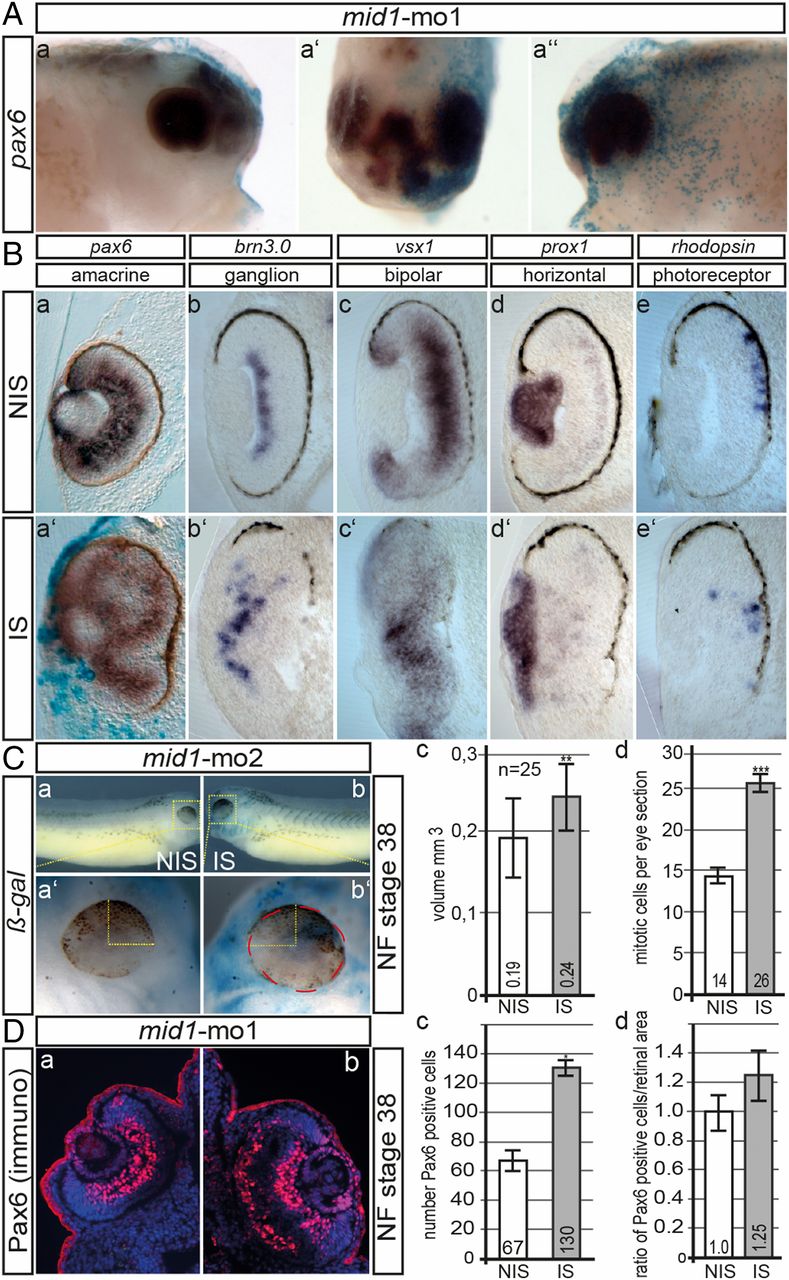 Fig. 4. Mid1 loss of function interferes with eye development. (A and B) 2.5 pmol of mid1-mo1 was injected into one cell at the two-cell stage and analyzed by Wmish at NF stage 38. (Upper) Lateral views of head region of noninjected (a; NIS) or injected side (aâ²; IS), dorsal view (aâ²). (B) Analysis of retinal stratification on mid1 suppression in transversal sections at the level of the lens using probes against pax6, brn3.0, vsx1, prox1, and rhodopsin. For better comparison, all images are oriented with the lens to the left. (C) Lateral view (a and b) of NF stage 38 embryos injected with mid1-mo2 into one cell at the two-cell stage and 10Ã enlarged view of the eye region of aâ² and bâ² (Lower). All mid1-mo2âinjected embryos showed an increase in eye size (n = 212 mid1-mo2 and n = 126 ctrl-moâinjected embryos). The graph shows the mean values for 25 embryos (c; **P = 0.001). Analysis of cell proliferation of mid1-mo2âinjected embryos. The number of phospho-histone H3 (pH3) positive cells were counted and compared. (d; ctrl-mo: six embryos, mean 14.4 pH3+ cells per section; mid1-mo2: eight embryos, mean 27.2 pH3+ cells per section; ***P = 0.0006). (D) Pax6 immunoreactivity in cryosections on mid1-mo1 injection. The number of Pax6-positive cells per sections within the retinal region was counted for both sides of two embryos, and the area of the total retina was estimated. The numbers of Pax6-positive cells from sections of three mid1-mo1âinjected embryos were counted (c; *P = 0.03); the numbers of Pax6-positive cells relative to the area of the retina is shown in the right diagram (d). The value for the noninjected side was set to 1.