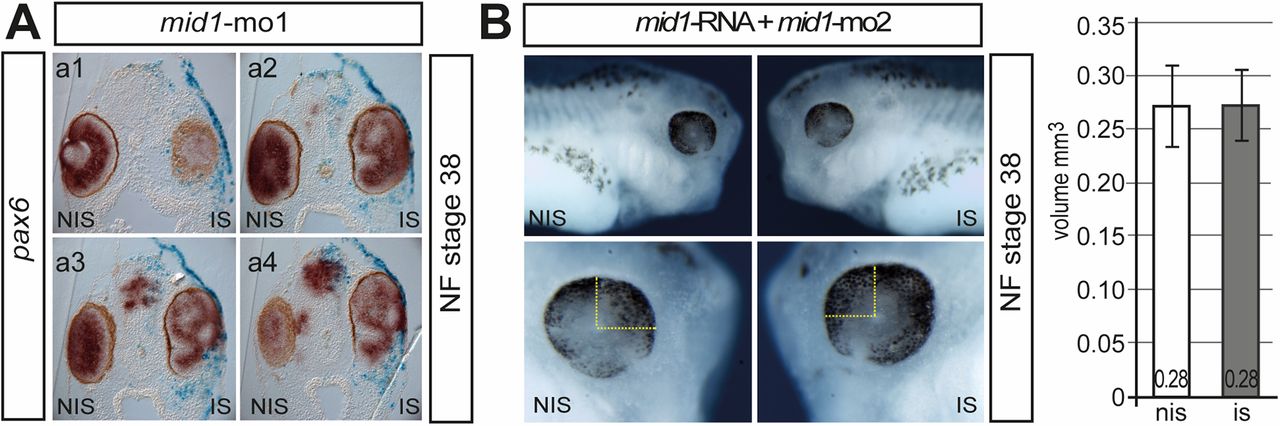 Fig. S3. (A) a1âa4 show a series of transversal sections at the level of the eye of the mid1 injected tadpole (NF stage 38) shown in Fig. 1 A, a. (B) Rescue of the mid1 knockdown eye phenotype. Lateral view of NF stage 38 embryos injected with mid1-mo2 (1.25 pmol) along with synthetic human mid1 RNA (1â2 ng) into one cell of a 2-cell stage embryo. The lower panel shows a 10Ã enlarged view of the respective eye region. Considering the eye to be an oblate spheroid, the mean radius was estimated by measuring the drawn distances and total volume was calculated. The graph shows the mean values for 20 embryos. The specificity of the pax2 and pax6 morpholino had been tested already by rescue experiments in refs. 53 and 54, respectively.