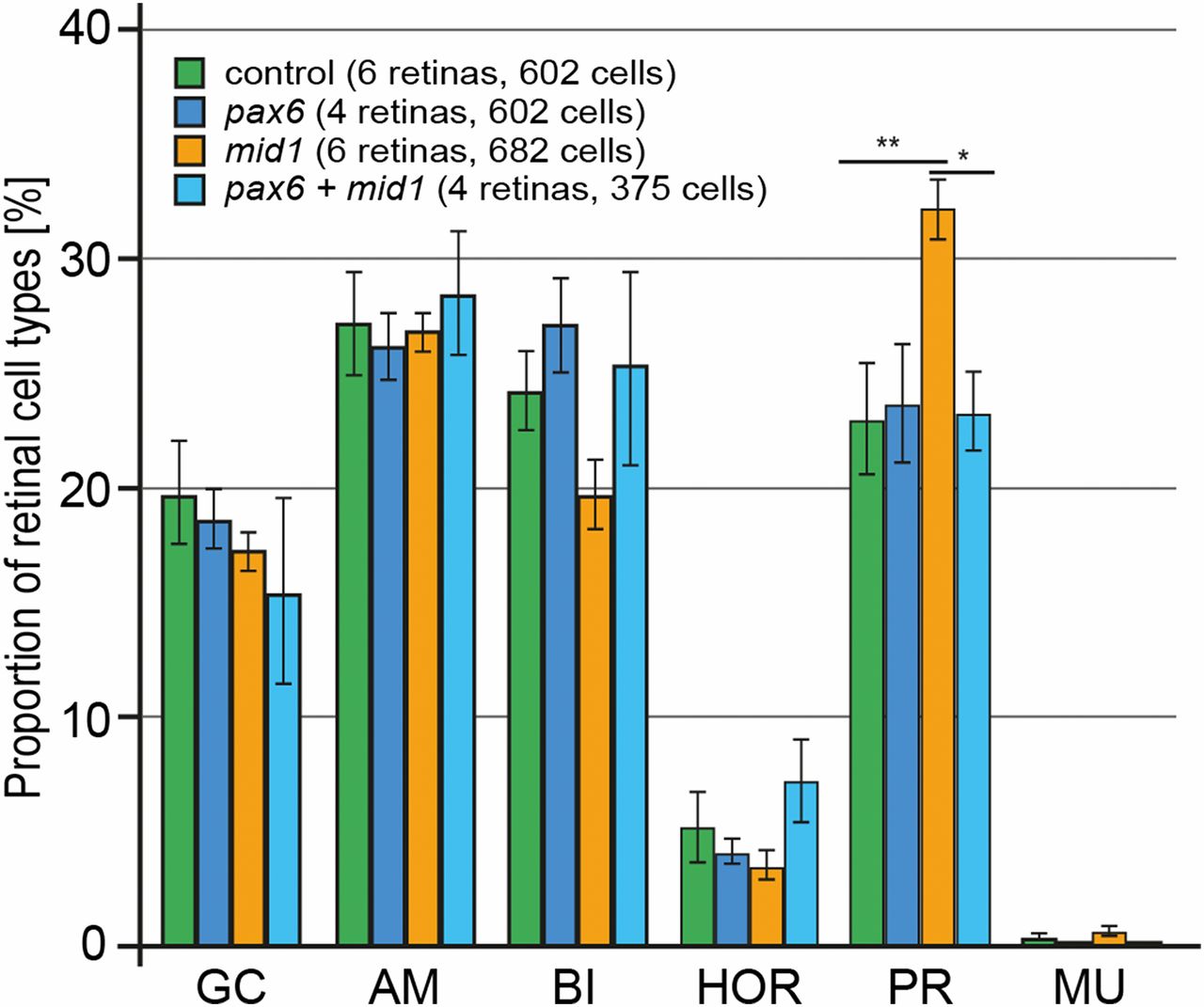 Fig. 5. Targeted overexpression of mid1 affects fate of retinal precursor cells, which can be reversed by pax6 coexpression. Cell fate analysis at stage 41 following overexpression of the indicated constructs by in vivo lipofection at the neurula stage. GFP was used as a tracer to visualize transfected cells. The error bars represent SEM. AM, amacrine cells; BI, bipolar cells; GC, ganglion cells; HOR, horizontal cells; MU, Müller cells; PR, photoreceptor cells.