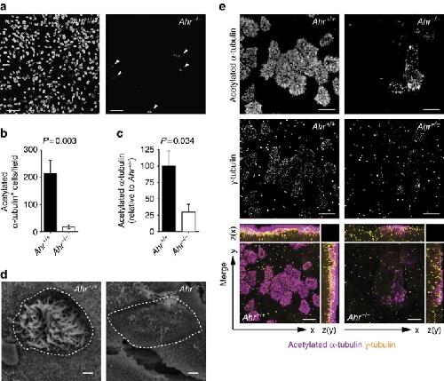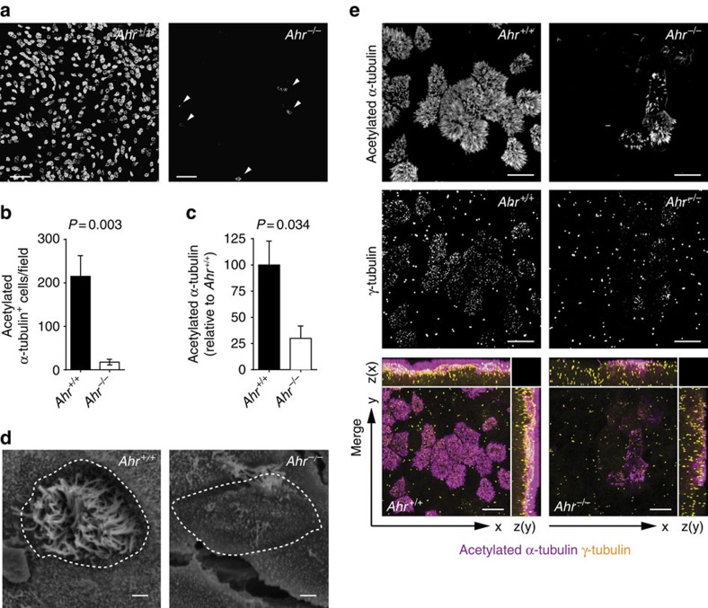 Figure 1. Multiciliated cell generation is markedly reduced in AhR-deficient mTEC cultures.(a) Immunofluorescent staining of acetylated α-tubulin in AhR-sufficient and AhR-deficient mTEC cultures following 9 days of ALI. Arrowheads indicate the few multiciliated cells (acetylated α-tubulin+) developing from Ahr−/− cultures. Scale bars, 50 μm. (b) Number of acetylated α-tubulin+ cells per field in wt and Ahr−/− mTEC cultures after 9 days of ALI. Mean±s.e.m.; Student's t-test (unpaired, two-tailed). n=5 random fields per group. (c) Quantification of acetylated α-tubulin fluorescence intensity from entire wells of AhR-sufficient and AhR-deficient mTEC cultures at day 9 of ALI. Fluorescence intensity of Ahr+/+ condition was set as 100%. n=3 wells per group. Mean±s.e.m.; Student's t-test (unpaired, two-tailed). Data in a–c are from five independent experiments. (d) Scanning electron microscopy (SEM) images of AhR-sufficient and AhR-deficient mTEC cultures at 9 days of ALI. Dashed lines indicate the multiciliated cell perimeter. Scale bars, 1 μm. Data representative of two independent experiments. (e) Immunofluorescent staining of acetylated α-tubulin (cilia, violet) and γ-tubulin (centrioles/basal bodies, yellow) in AhR-sufficient and AhR-deficient mTEC cultures at 9 days of ALI. Scale bars, 10 μm. Data representative of three independent experiments.