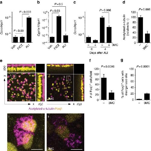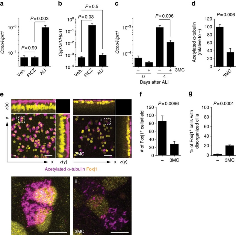 Figure 6. Environmental cues differentially regulate AhR transcriptional activity and can interfere with each other.(a,b) mRNA expression levels of Ccno and Cyp1a1 in wt mTEC cultures treated with vehicle or FICZ (for 2 days before ALI onset) or grown in ALI for 4 days. Values are normalized to Hprt1. Mean±s.e.m.; Student's t-test (unpaired, two-tailed). Data representative of three independent experiments. (c) mRNA expression levels of Ccno in AhR-sufficient mTEC cultures at indicated days of ALI and treated with 3-methylcholanthrene (3MC) or vehicle starting 2 days before ALI onset. Values are normalized to Hprt1. Mean±s.e.m.; Student's t-test (unpaired, two-tailed). Data representative of three independent experiments. (d) Quantification of acetylated α-tubulin fluorescence intensity from entire wells of Ahr+/+ mTEC cultures at 8 days of ALI in the presence or absence of 3MC. Fluorescence intensity of vehicle-treated control (−) was set as 100%. Mean±s.e.m.; Student's t-test (unpaired, two-tailed). Data representative of three independent experiments. (e) Immunofluorescent staining of acetylated α-tubulin (cilia, violet) and Foxj1 (yellow) in AhR-sufficient mTEC cultures at 8 days of ALI in the presence of 3MC or vehicle. Dashed boxes indicate insets (i,ii). Scale bars, 20 μm (5 μm for insets i and ii). (f) Number of Foxj1+ cells per field in AhR-sufficient mTEC cultures at 8 days of ALI in the presence or absence of 3MC. Mean±s.e.m.; Student's t-test (unpaired, two-tailed). n=5 random fields per group. (g) Fraction of Foxj1+ cells bearing a disorganized pattern of cilia (uneven distribution on the apical surface; intracytosolic staining of acetylated α-tubulin) in Ahr+/+ mTEC cultures at 8 days of ALI in the presence or absence of 3MC. Mean±s.e.m.; Student's t-test (unpaired, two-tailed). n=5 random fields per group. Data in e–g are representative of two independent experiments.
