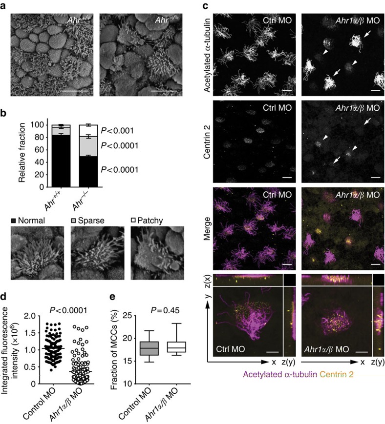 Figure 3. Deletion of Ahr leads to an aberrant cilia pattern in both mouse and Xenopus laevis embryos.(a) SEM images of tracheae from Ahr+/+ and Ahr−/− E18.5 embryos. Scale bars, 5 μm. (b) Relative fraction of multiciliated cells in E18.5 embryonic tracheae as in a, classified by their ciliar pattern (normal, sparse and patchy). No significant differences were observed in the number of multiciliated cells per field between the two genotypes. Mean±s.e.m.; two-way analysis of variance (variables: genotype and cilia pattern) with Sidak's multiple comparison test. Data from two independent litters (n=5–9). (c) Multiciliated cells containing Ahr1α/β morpholinos (Ahr1α/β MO—arrowheads) in Ahr1α/β MO-injected embryos develop very few cilia, and basal bodies fail to migrate and dock at the apical surface, compared either with cells that are uninjected (arrows) or with cells in embryos injected with control MO. Scale bars, 15 μm. Bottom panels show the accumulation of acetylated α-tubulin above the apical surface of the cell in control morphants, while in Ahr1α/β morphants, microtubules amass below the apical surface. Scale bars, 5 μm. (d) Quantification of integrated fluorescence intensity of acetylated α-tubulin above the apical surface of multiciliated cells, from the embryonic skin of X. laevis injected with Ahr1α/β or control MO. Mean; Student's t-test (unpaired, two-tailed). Data representative of three independent experiments. (e) Fraction of multiciliated cells, from the embryonic skin of X. laevis injected with Ahr1α/β or control MO. Mean±maximum and minimum; Student's t-test (unpaired, two-tailed). Data representative of three independent experiments. Ctrl, control; MCCs, multiciliated cells.
