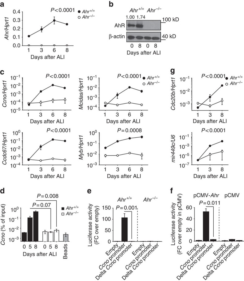 Figure 4. AhR controls Ccno expression and regulates the transcriptional programme required for ciliogenesis.(a,c) mRNA expression levels of the indicated genes in Ahr+/+ and Ahr−/− mTEC cultures at indicated days of ALI. Values are normalized to Hprt1. Mean±s.e.m.; two-way analysis of variance (variables: genotype and time). Data representative of at least three independent experiments. (b) Immunoblot and densitometric analysis of AhR protein expression as compared with β-actin, in AhR-sufficient and AhR-deficient mTEC cultures at days 0 and 8 of ALI. Data representative of three independent experiments. (d) Chromatin immunoprecipitation (ChIP) analysis of AhR interaction with the Ccno promoter in wt and Ahr−/− mTEC cultures at indicated days of ALI. Mean±s.e.m.; Student's t-test (unpaired, two-tailed). Data representative of three independent experiments. (e) Luciferase reporter assay was performed in AhR-sufficient and AhR-deficient mTEC cultures transfected at 5 days of ALI and analysed 36 h post transfection. Delta Ccno promoter lacks predicted AhR response elements. Mean±s.e.m.; Student's t-test. Data representative of two independent experiments. (f) Luciferase reporter assay was performed in NIH3T3 cells. Cells were co-transfected with a plasmid encoding AhR (pCMV-Ahr) or control vector (pCMV) and a luciferase-encoding reporter gene downstream of the Ccno promoter. Cells were analysed 36 h post transfection. Delta Ccno promoter lacks predicted AhR response elements. Empty indicates the control reporter vector. Mean±s.e.m. Student's t-test. Data representative of two independent experiments. (g) mRNA expression levels of Cdc20b (normalized to Hprt1) and mir449c (normalized to U6) in Ahr+/+ and Ahr−/− mTEC cultures at indicated days of ALI. Mean±s.e.m.; two-way analysis of variance (variables: genotype and time). Data are representative of three independent experiments. FC, fold change.