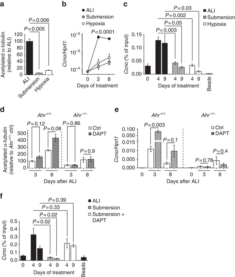 Figure 5. AhR-mediated Ccno expression is prevented by Notch signalling and requires normoxic air exposure.(a) Quantification of acetylated α-tubulin fluorescence intensity from entire wells of AhR-sufficient mTEC cultures grown for 8 days in ALI, submersion or ALI under hypoxic condition. Fluorescence intensity of ALI condition was set as 100%. Mean±s.e.m.; Student's t-test (unpaired, two-tailed). n=3 wells per group, data from three independent experiments. (b) mRNA expression levels of Ccno in Ahr+/+ mTEC cultures grown in ALI, submersion or ALI under hypoxic condition at indicated days of treatment. Values are normalized to Hprt1. Mean±s.e.m.; two-way analysis of variance (variables: treatment and time). Data representative of three independent experiments. (c) Chromatin immunoprecipitation (ChIP) analysis of AhR interaction with the Ccno promoter in Ahr+/+ mTEC cultures grown in ALI, submersion or ALI under hypoxic condition at indicated days of treatment. Mean±s.e.m.; Student's t-test (unpaired, two-tailed). Data representative of three independent experiments. (d) Quantification of acetylated α-tubulin fluorescence intensity from entire wells of AhR-sufficient and AhR-deficient mTEC cultures at indicated days of ALI in presence or absence of DAPT. Fluorescence intensity of Ahr+/+ mTEC culture at 3 days of ALI was set as 100%. Mean±s.e.m.; Student's t-test (unpaired, two-tailed). Data representative of three independent experiments. (e) mRNA expression levels of Ccno in Ahr+/+ and Ahr−/− mTEC cultures at indicated days of ALI in presence of DAPT or vehicle control. Values are normalized to Hprt1. Mean±s.e.m.; Student's t-test (unpaired, two-tailed). Data representative of three independent experiments. (f) ChIP analysis of AhR interaction with the Ccno promoter in AhR-sufficient mTEC cultures grown in ALI or submersion in the presence of DAPT or vehicle control. Mean±s.e.m.; Student's t-test (unpaired, two-tailed). Data representative of two independent experiments. Ctrl, control.
