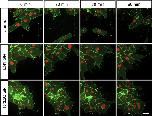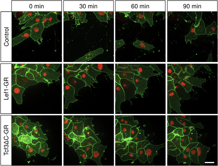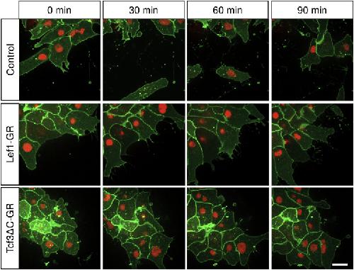 Fig. 6. Modulation of canonical Wnt signaling does not affect protrusion formation, but the ability to leave the cell cluster. Explanted control (upper panel), Lef1-GR expressing (middle panel) and Tcf3âC-GR expressing (lower panel) NC cells were imaged using a 63x oil objective (NA 1.4). Explants are shown at the start of imaging and after 30, 60 and 90 min of imaging. The scale bar resembles 20 µm. |