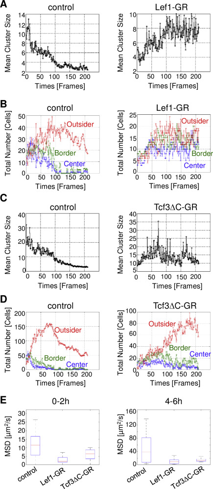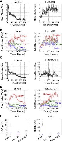 Fig. 7. The collective in vitro NC migration behavior is affected by modulation of canonical Wnt signaling. Collective NC migration behavior was characterized by analyzing changes in mean cluster size (A,C), in classification of center, border and outsider cells (B,D) as well as determination of mean square displacement. For classification criteria see Material and Method section. A Changes in mean cluster size of control NC (left) and Lef1-GR (right) overexpressing cells over time. Time is given in âframesâ, which constitutes a time interval of 2.03 min. This is identical for all graphs shown in this Figs. B Cell classification of a control NC (left) and Lef1-GR expressing (right) explants. C Changes in mean cluster size of control NC (left) and Tcf3âC-GR (right) overexpressing cells over time. D Cell classification of control (left) and Tcf3âC-GR-overexpressing explants. E Comparison of the mean square displacement of control cells and NC cells overexpressing Lef1-GR or Tcf3âC-GR respectively. The mean square displacement is given for cell movement during the first 2 h of the experiment (left) compared to cell movements during a later time period in the course of the experiment (between 4 and 6 h) (right). |