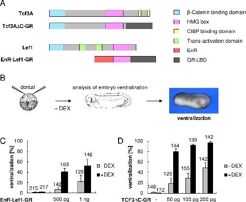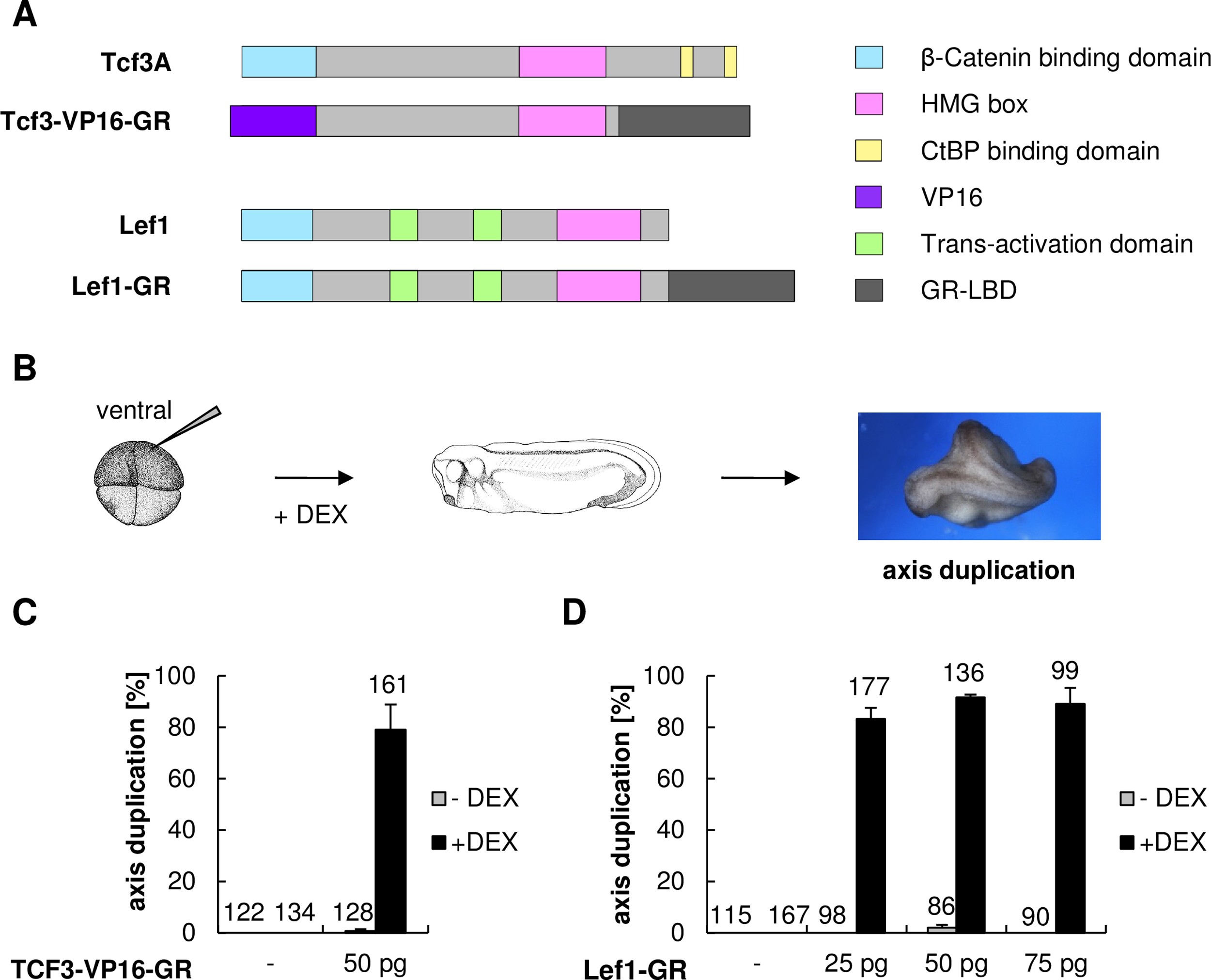 Supplementary material Supplement Fig. 5 EnR-Lef1-GR and Tcf3âC-GR inhibit canonical Wnt signaling as indicated by ventralization ofXenopusembryos. A Schematic representation of wild type and dominant negative GR-fusion constructs of Tcf3A and Lef1 employed for repression of canonical Wnt signaling. B Experimental set up: embryos were injected with the respective constructs in both dorsal blastomeres at the 4-cell stage, treated with Dexamethasone at the 16-cell stage, and ventralization was analyzed at early tailbud stages. C Graph summarizing the percentage of ventralized embryos in 3 independent experiments after injection of EnR-Lef1-GR. At low concentrations EnR-Lef1-GR overexpression did not show strong ventralizing activity and at high concentrations, it showed activation even in the absence of Dexamethasone. Injection of concentrations with no significant background level activity did not affect NC migration after treatment with Dexamethasone at premigratory or migratory NC cells stages (data not shown). D Graph summarizing the percentage of ventralized embryos of 3 independent experiments in embryos injected with increasing concentrations of Tcf3âC-GR RNA. Numbers of injected embryos and standard error of the means are indicated for each column. Tcf3âC-GR is a potent ventralizing agent, however, also active to some extent in the absence of Dexamethasone. Therefore, we used 50 pg for our migration assays, as background effects are comparably low at this concentration |