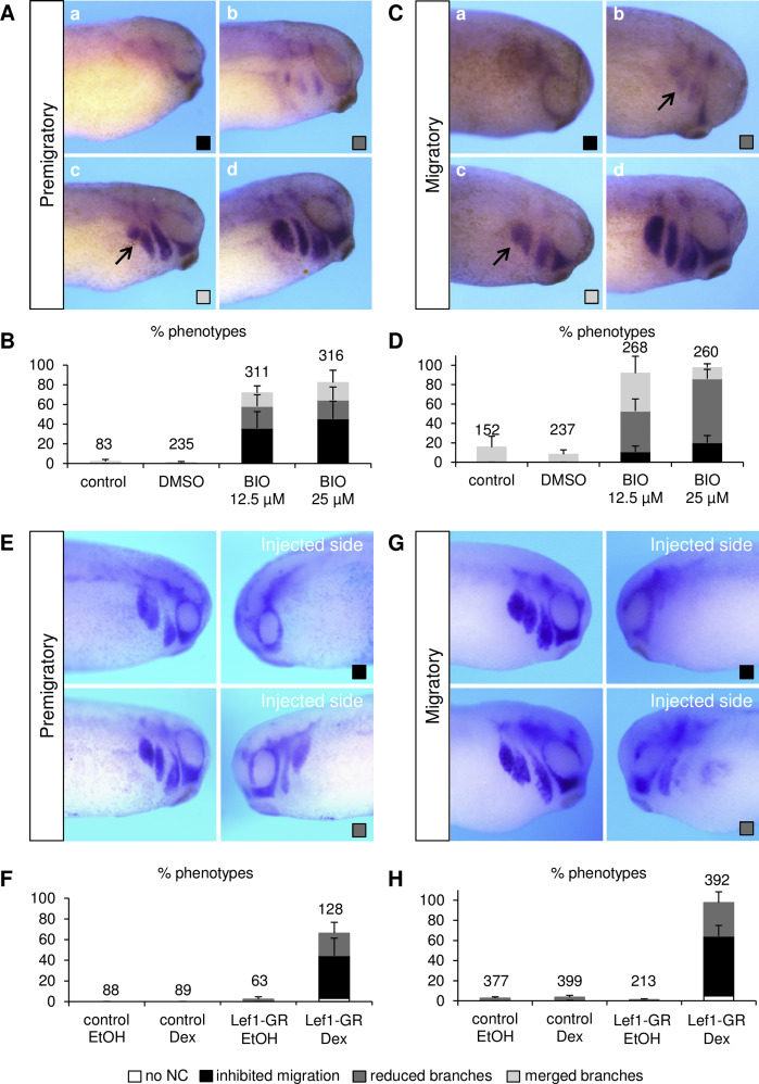 Fig. 2. Activation of canonical Wnt signaling at premigratory and migratory NC cell stages affects NC migration. Wild type Xenopus embryos were treated with BIO at premigratory and migratory NC stages or with DMSO as a solvent control. NC migration was analyzed by Twist in situ hybridization. A The panel shows the different phenotypes observed after BIO treatment at premigratory stages. Phenotypes are categorized by decreasing severity: embryo with inhibited NC migration and reduced Twist expression (a), embryo with reduced NC branches (b), embryo with merged NC branches (c, arrow), unaffected embryo (d). B Graph summarizing the percentage of phenotypes observed in 5 independent experiments. Standard errors of the mean and number of treated embryos are indicated for each column. C The panel shows the different phenotypes observed after BIO treatment at migratory stages. Phenotypes are categorized by decreasing severity as for the premigratory treatment. Arrows mark reduced NC branches in (b) and merged branches in (c), unaffected embryo (d). D Graph summarizing the percentage of phenotypes observed in three independent experiments. Standard errors of the mean and number of treated embryos are indicated for each column. E,G Wild type Xenopus embryos were injected with 50 pg Lef1-GR RNA at the two-cell stage and treated with Dexamethasone at NC premigratory (E) and migratory stages (G). NC migration was analyzed by Twist in situ hybridization. E Panel shows the different phenotypes observed after Lef1-GR activation at premigratory stages: embryo with inhibited NC migration and reduced Twist expression (upper panel), embryo with reduced NC branches (lower panel). The injected side is shown on the right. F Graph summarizing the percentage of phenotypes observed in six independent experiments. Standard errors of the mean and number of injected embryos are indicated for each column. G The panel shows the different phenotypes observed after Lef1-GR activation at migratory stages. The injected side of the embryo is shown on the right. Phenotypes are categorized as in the premigratory treatment. H The graph summarizes nine independent experiments. Standard errors of the mean and number of injected embryos are indicated for each column. |