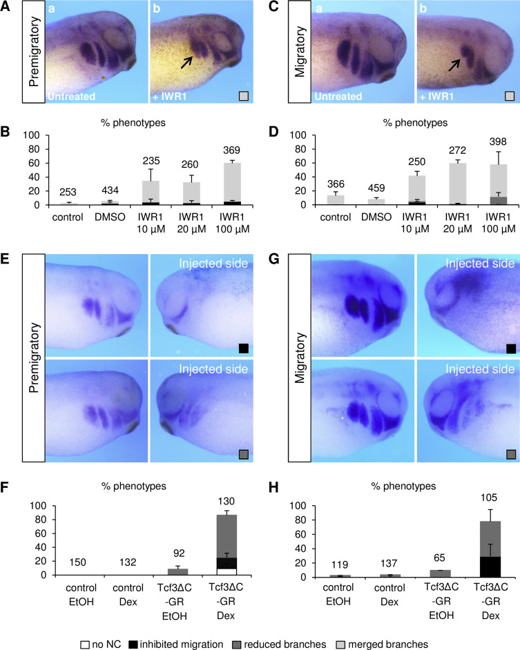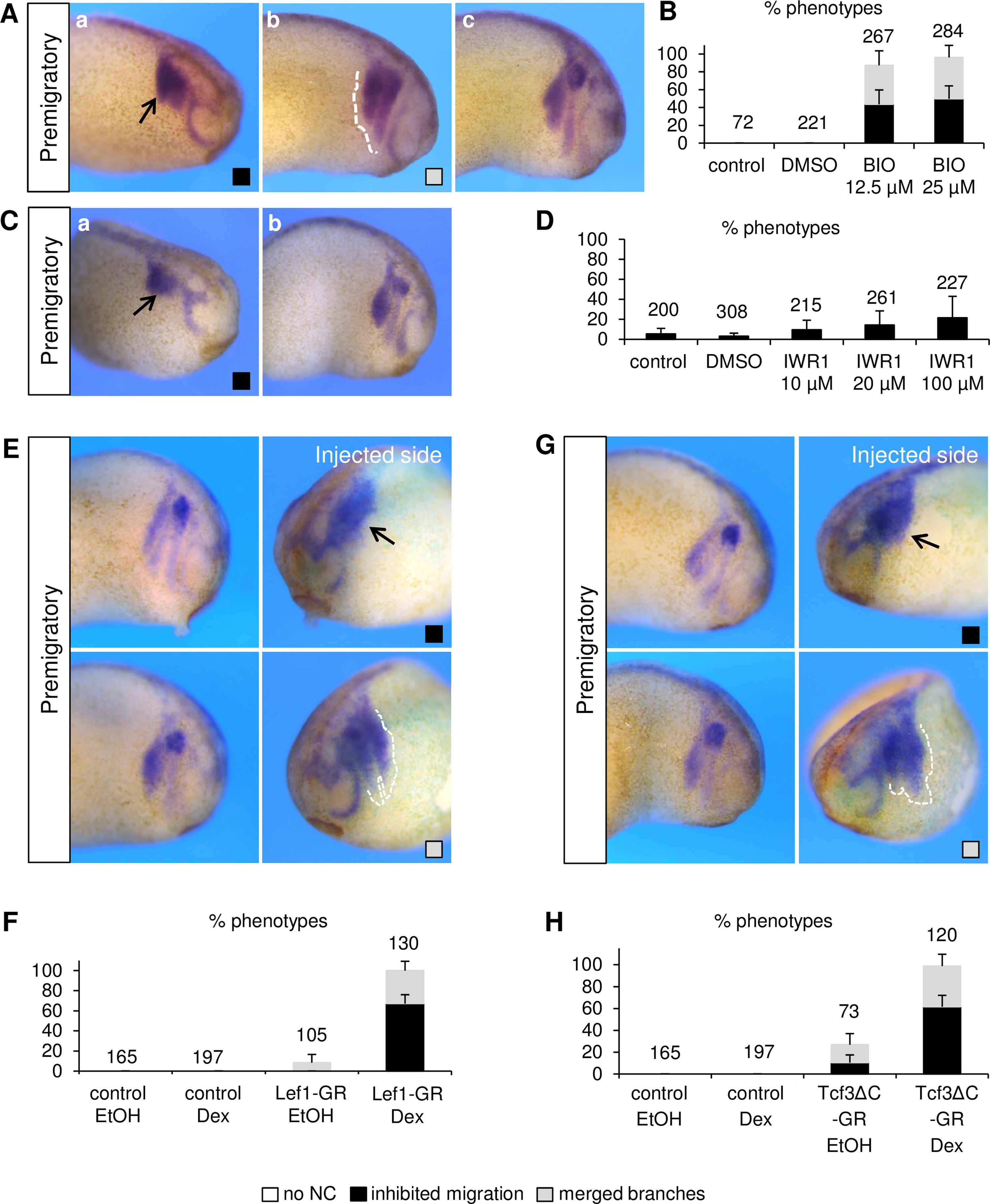 Fig. 3. Inhibition of canonical Wnt signaling at premigratory and migratory NC cell stages affects NC migration. Wild type Xenopus embryos were treated with IWR1 at NC premigratory and migratory stages. DMSO treatment served as a solvent control. NC migration was analyzed by Twist in situ hybridization. A The panel shows an embryo with merged NC branches (right panel, arrow), the phenotype observed after IWR1 treatment at premigratory stages. An untreated control embryo is shown on the left. B Graph summarizing the percentage of phenotypes of four independent experiments. Standard errors of the mean and number of treated embryos are indicated for each column. C Embryo with merged NC branches (right panel, arrow) after IWR1 treatment at migratory stages. A control embryo is shown on the left. D The graph summarizes three independent experiments. Standard errors of the mean and number of treated embryos are indicated for each column. E Wild type Xenopus embryos were injected with Tcf3âC-GR RNA in one blastomere at the two-cell stage and embryos were treated with Dexamethasone at NC premigratory and migratory stages. NC migration was analyzed by Twist in situ hybridization. The panel shows the different phenotypes observed after Tcf3âC-GR activation at premigratory stages: embryo with inhibited NC migration and reduced Twist expression (upper panel), embryo with reduced NC branches (lower panel). The injected side of the embryos is shown on the right. F Graph summarizing the percentage of phenotypes in 9 independent experiments. Standard errors of the mean and number of injected embryos are indicated for each column. G The panel shows the different phenotypes observed after Tcf3âC-GR activation at migratory stages. The same phenotypes as for the premigratory Dexamethasone treatment are observed. The injected side of the embryo is shown on the right. H Graph summarizing three independent experiments. Standard errors of the mean and number of injected embryos are indicated for each column. |